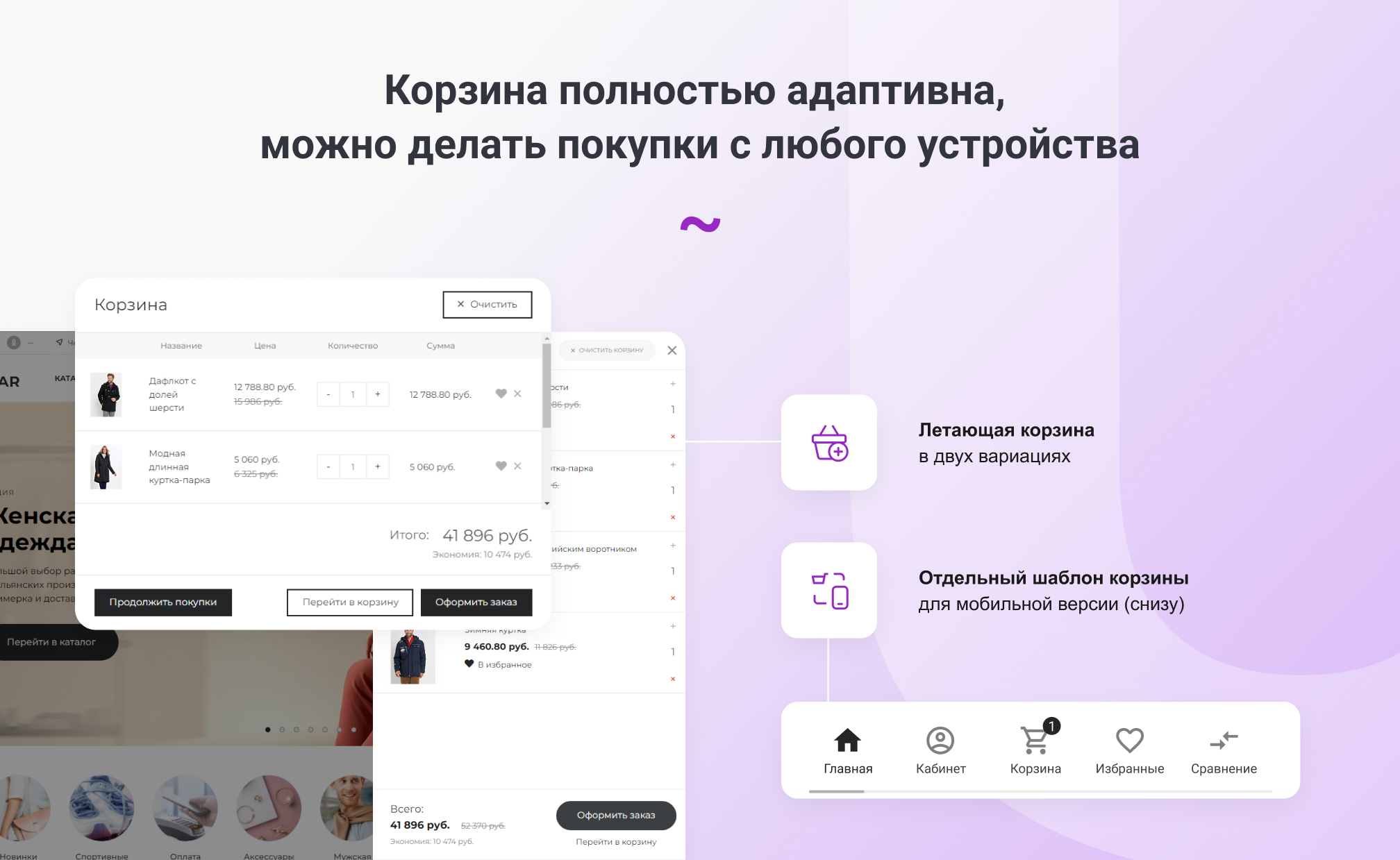 Летающая корзина в двух вариациях, отдельный шаблон корзины (снизу) для мобильной версии.