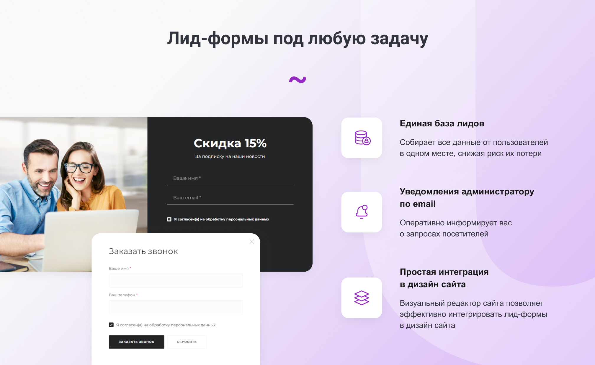 Гибкая настройка вида и основных полей лид-форм позволяют использовать формы для решения