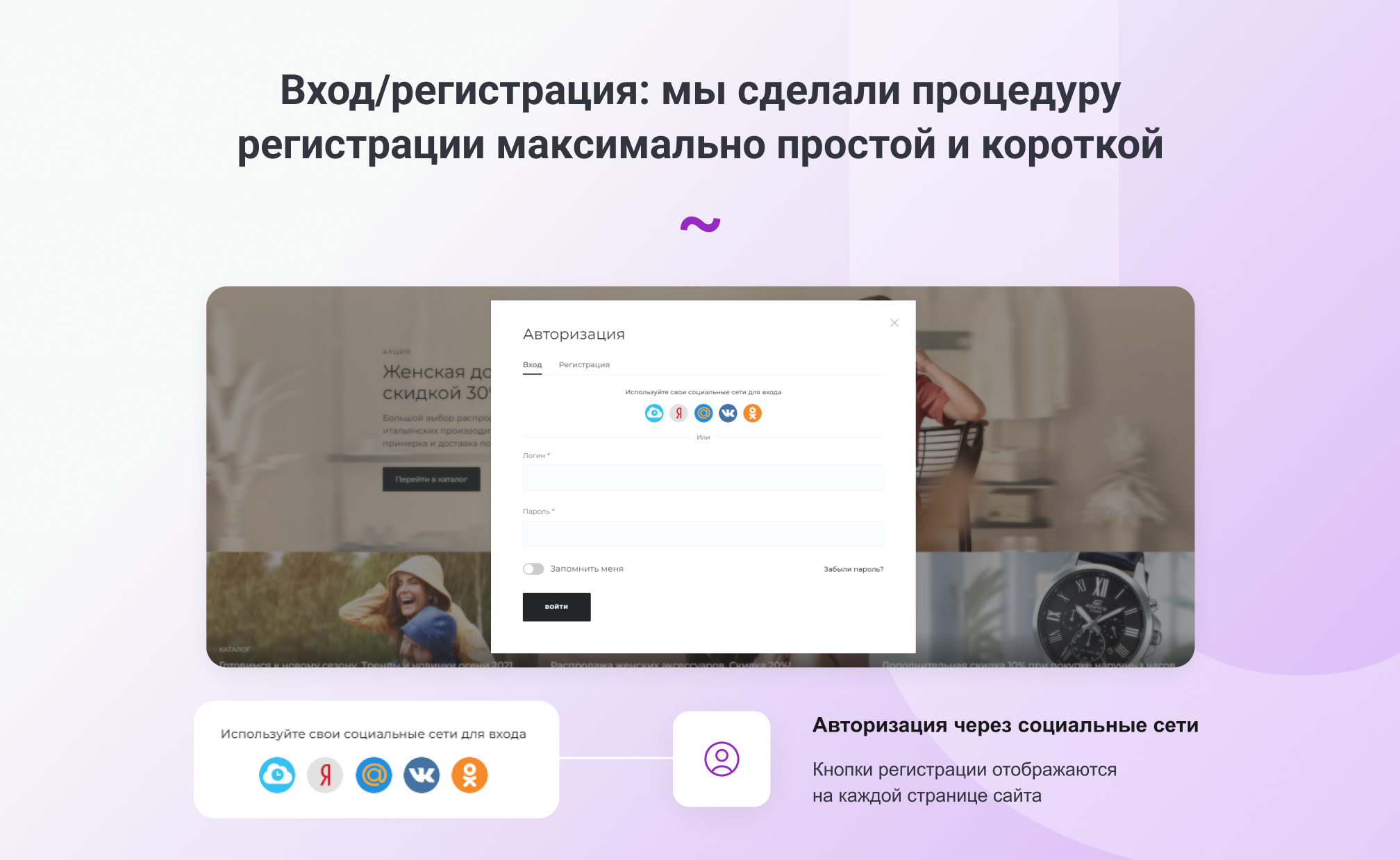 Есть возможность входа или регистрации через популярные соцсети ВКонтакте, Facebook, Twitter,