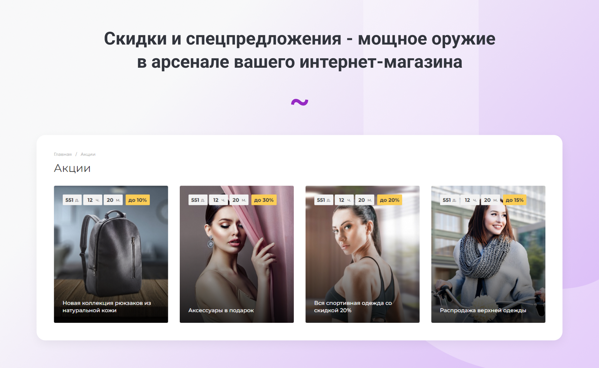 товара и скидках. Можно привязывать к акции Товары, Разделы, выводить условия акций с иконками или