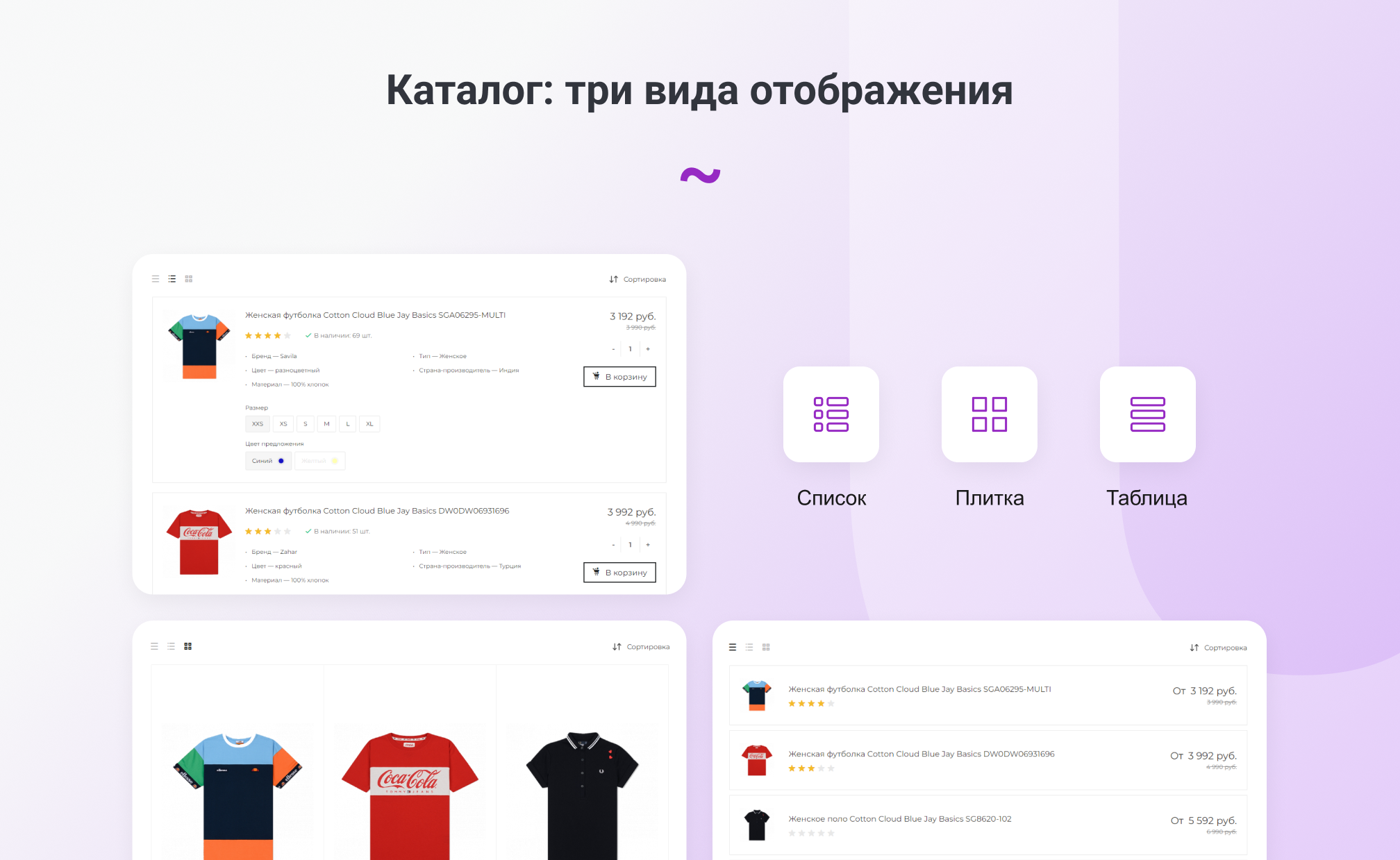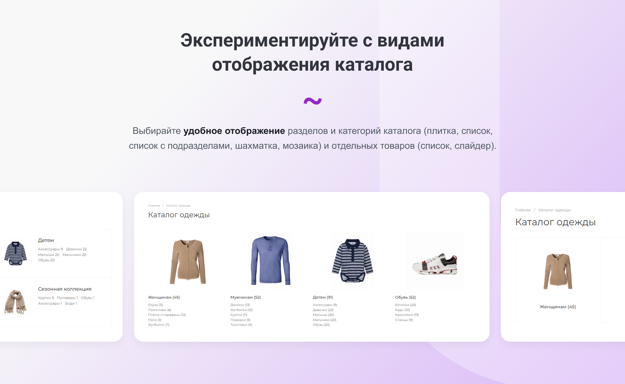 Выбирайте удобное отображение разделов и категорий каталога (плитка, список, список с