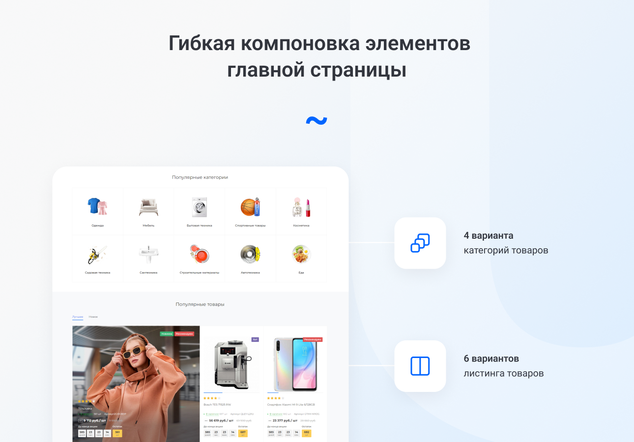Гибкая компоновка элементов главной страницы: 4 варианта категорий товаров, 6 вариантов листинга товаров.
