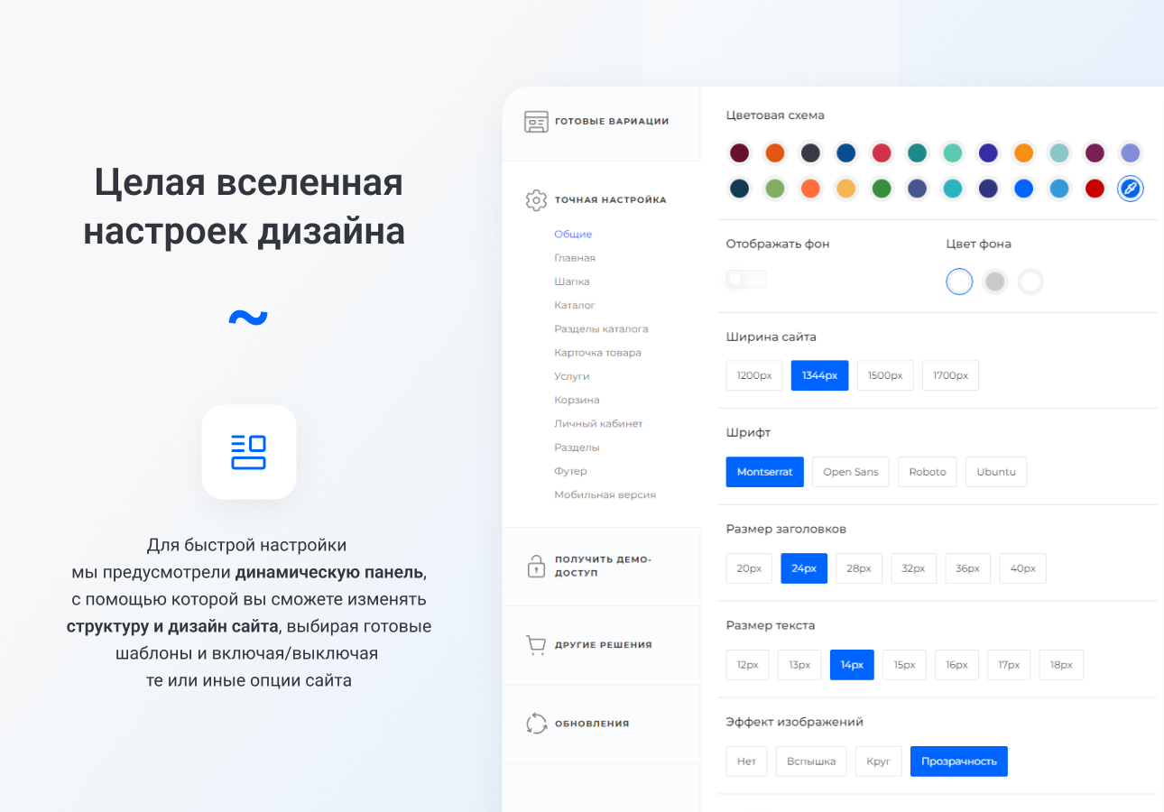 Для быстрой настройки мы предусмотрели динамическую панель, с помощью которой вы сможете изменять структуру и дизайн сайта, выбирая готовые шаблоны и включая/выключая те или иные опции сайта.