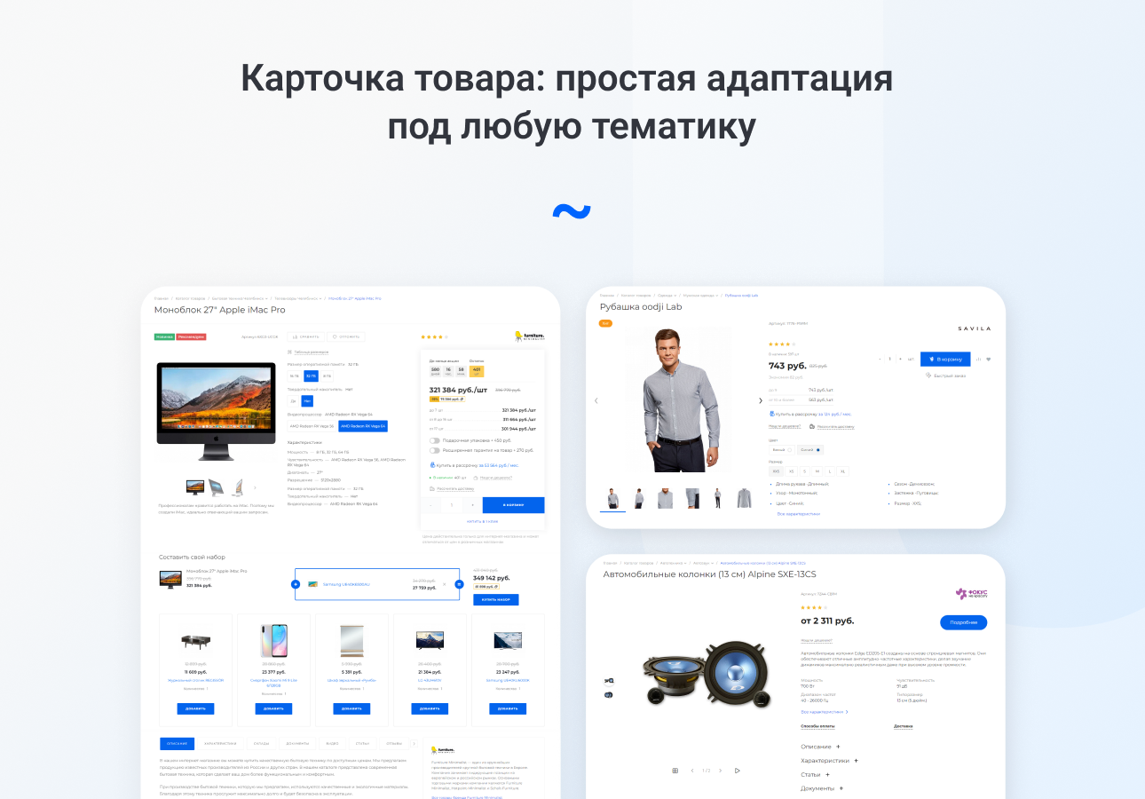 - гибкая настройка карточки товара: несколько типов товаров (промышленные товары, потребительские товары, одежда, услуги, недвижимость), выбор типа SKU, быстрый просмотр;