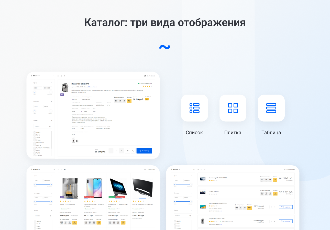 - несколько вариантов отображения основных разделов сайта: каталог, блог, новости, контакты;