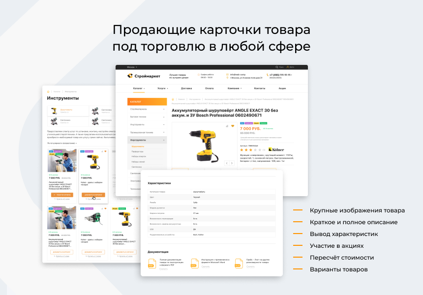 Дизайн – продуман маркетологами и UX-дизайнерами, отличается современным стилем и интуитивно понятен. Концепция решения WebComp:Market направлена на увеличение конверсии из посетителя в заказ.