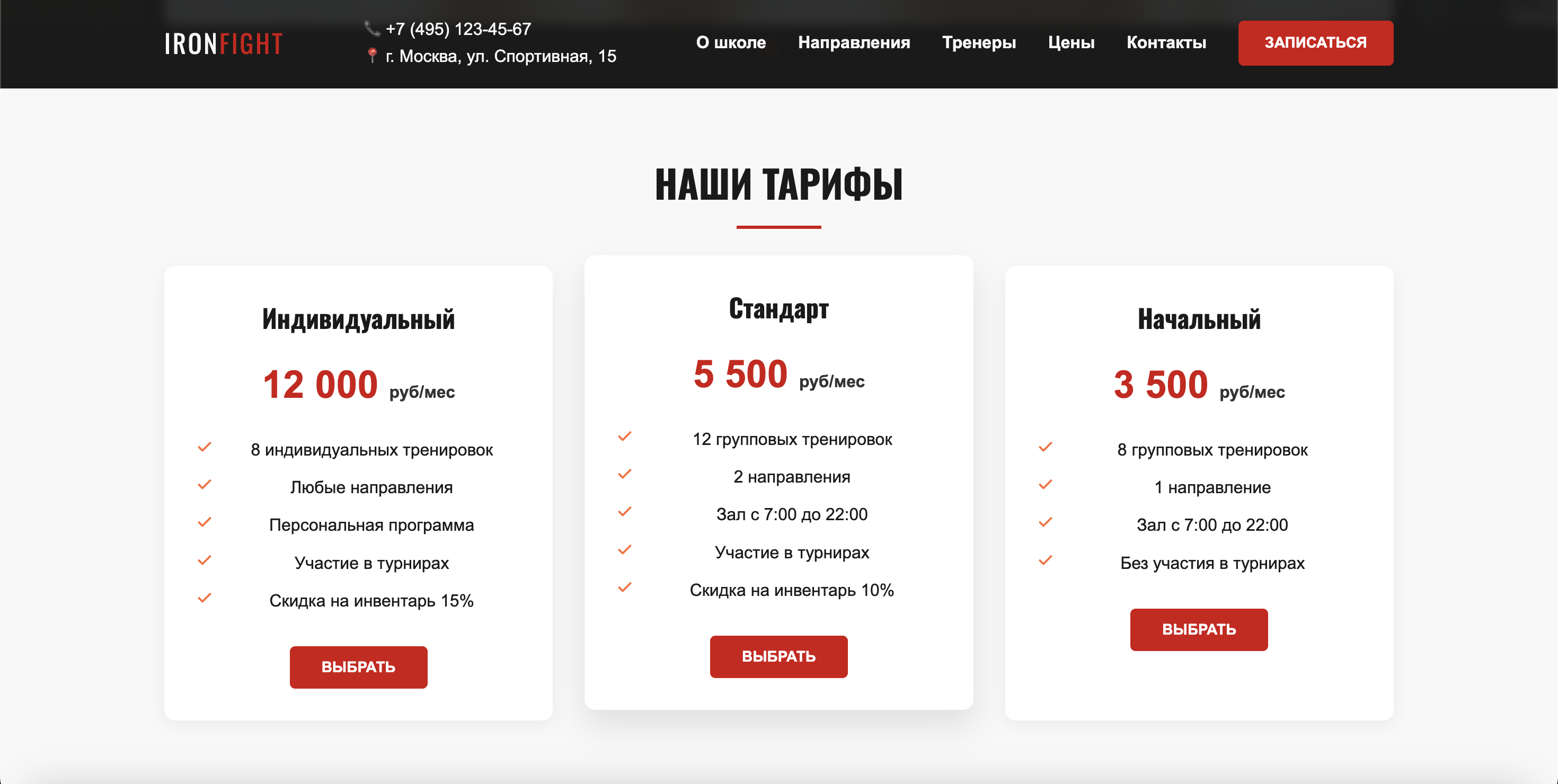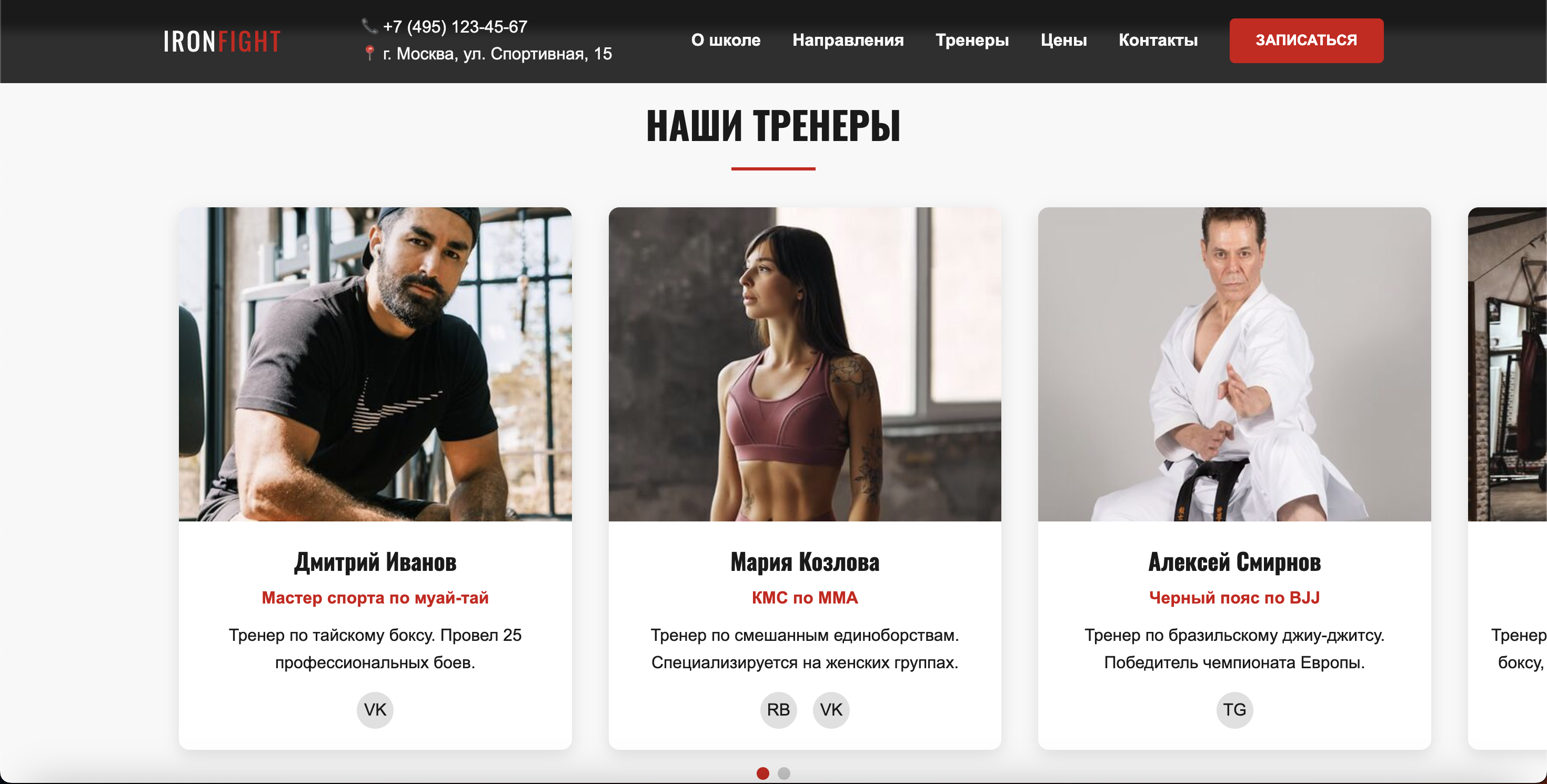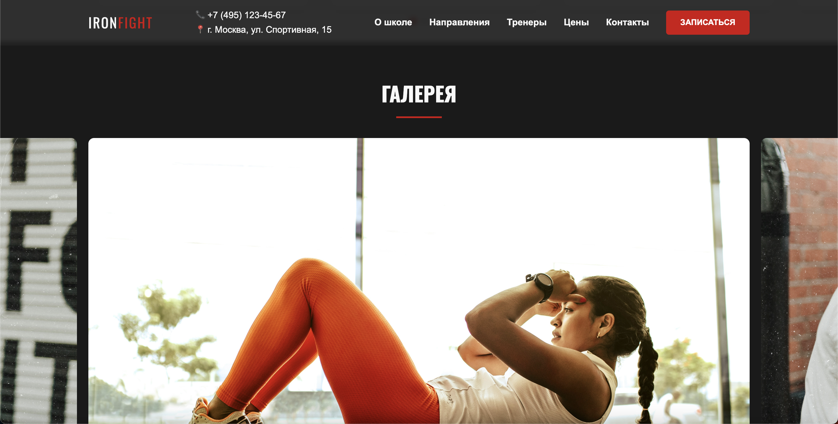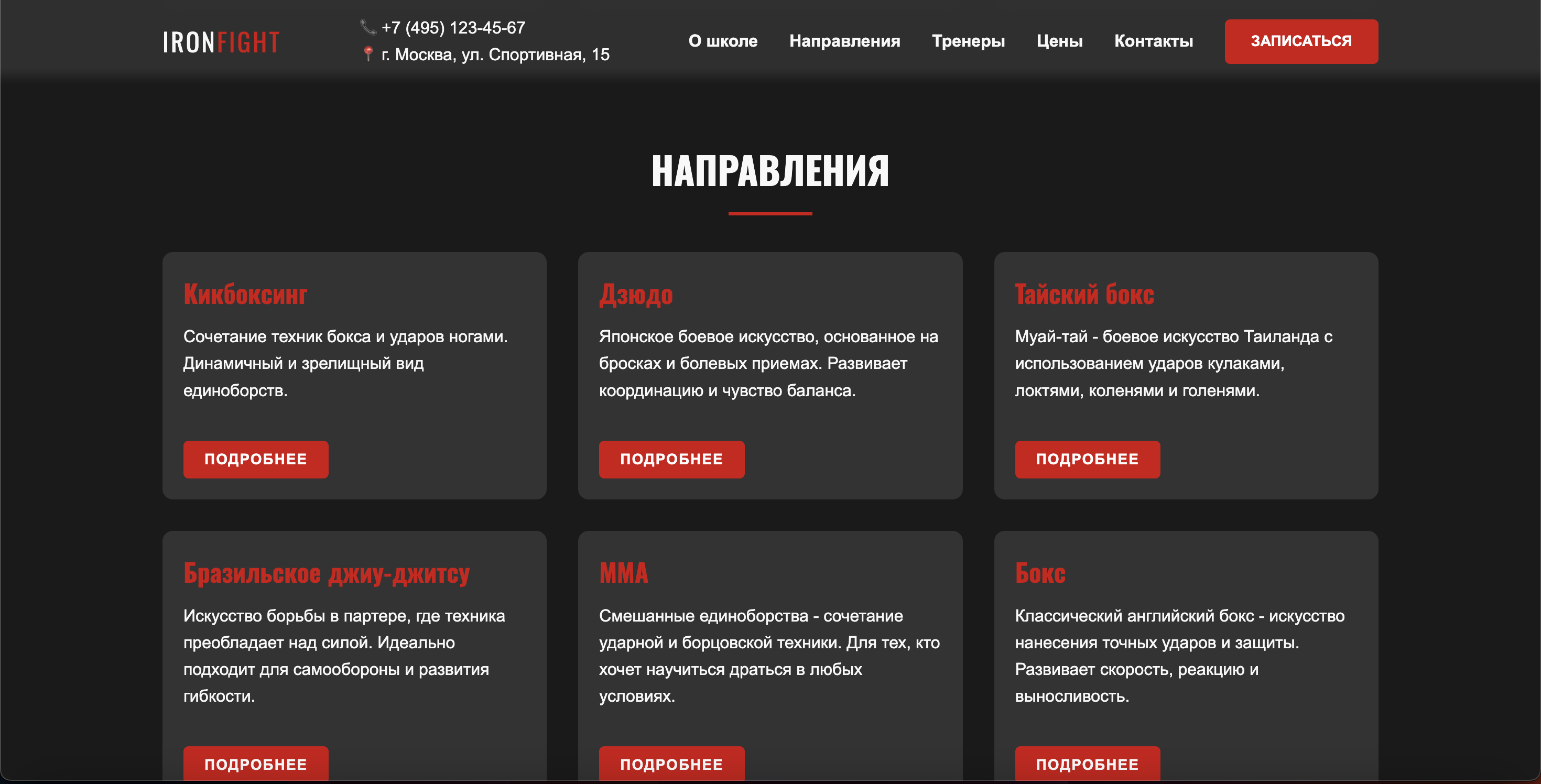 IronFight — современный адаптивный шаблон для сайтов спортивных клубов, фитнес-центров и боевых искусств, разработанный для платформы 1С-Битрикс. Шаблон сочетает в себе агрессивный спортивный дизайн.