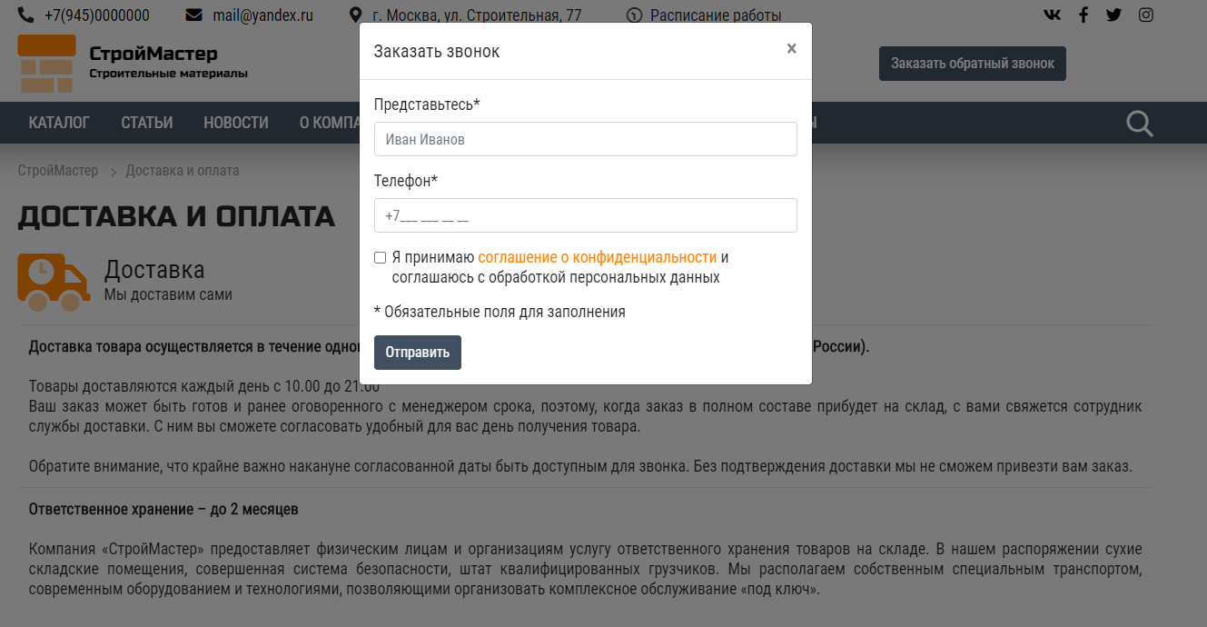 - Формы: Заказать товар, Заказать звонок, Заявка на аренду
