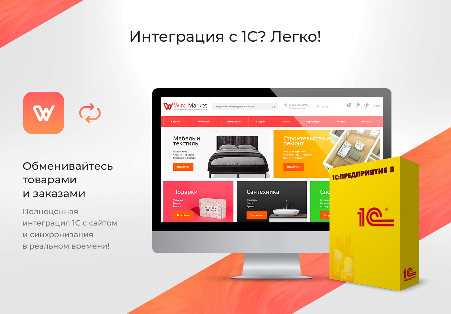 • Обмен данными с 1С. Обмен информацией о товарах (описание, фотографии, свойства); передача цен и остатков; обмен информацией о заказах.