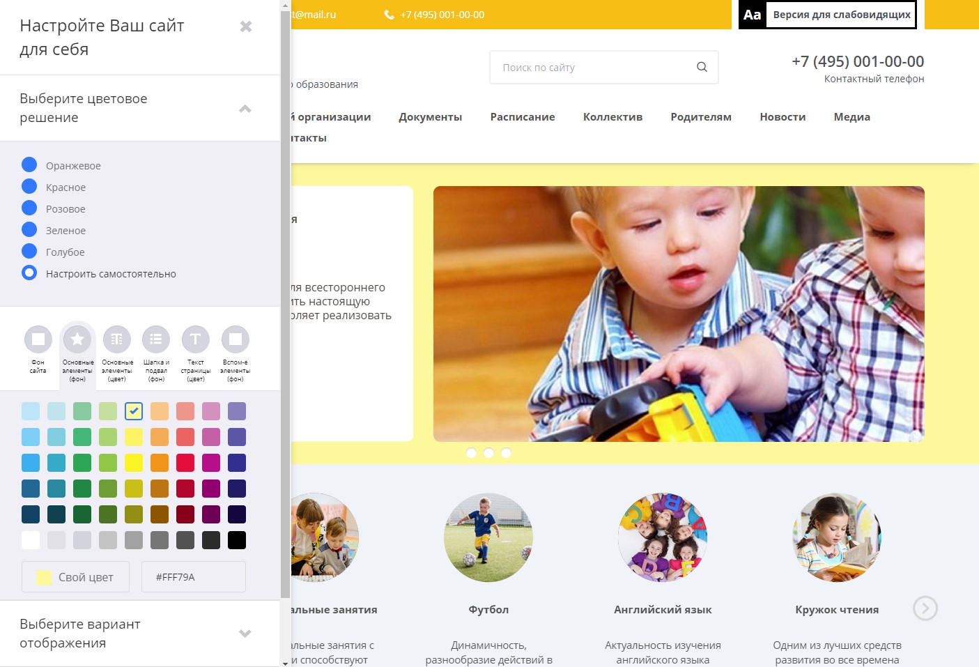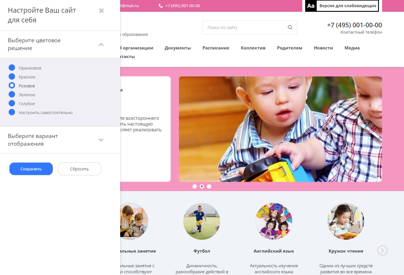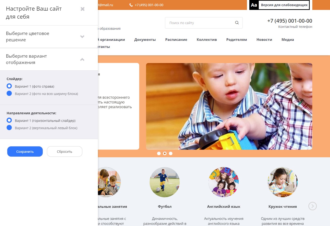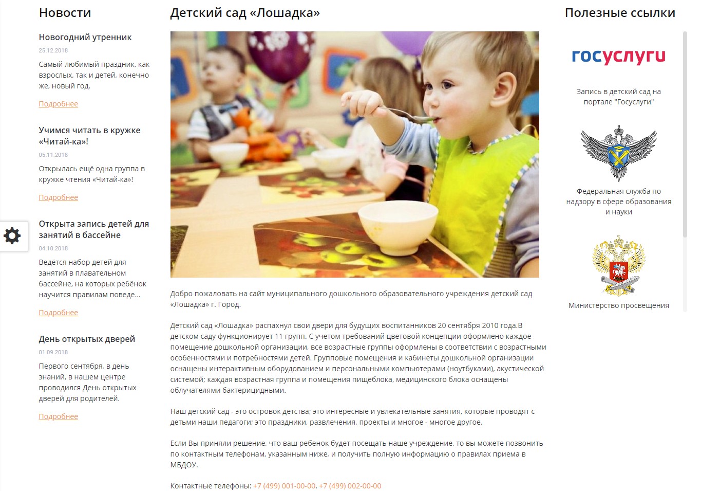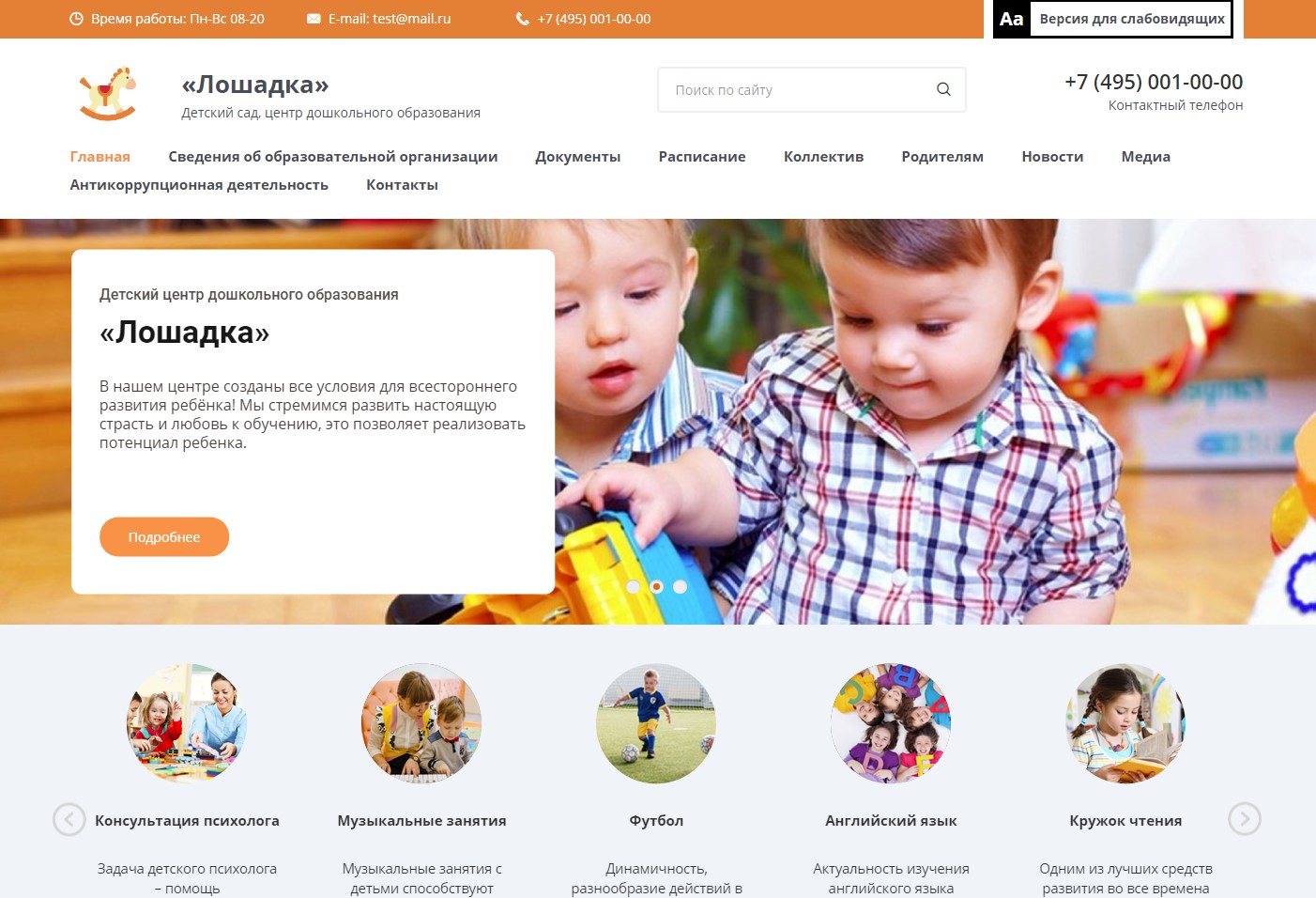 Универсальность Благодаря разработанному функционалу сайта решение легко адаптировать под любое детское дошкольное учреждение и любой контент | 2 варианта дизайна Адаптивная верстка сайта в 2х вариантах позволяет комфортно пользоваться сайтом, как на смартфоне и планшете, так и на ноутбуке и ПК | Готовая структура Готовая структура с демо-материалами для быстрого запуска позволит запустить сайт за несколько часов. |