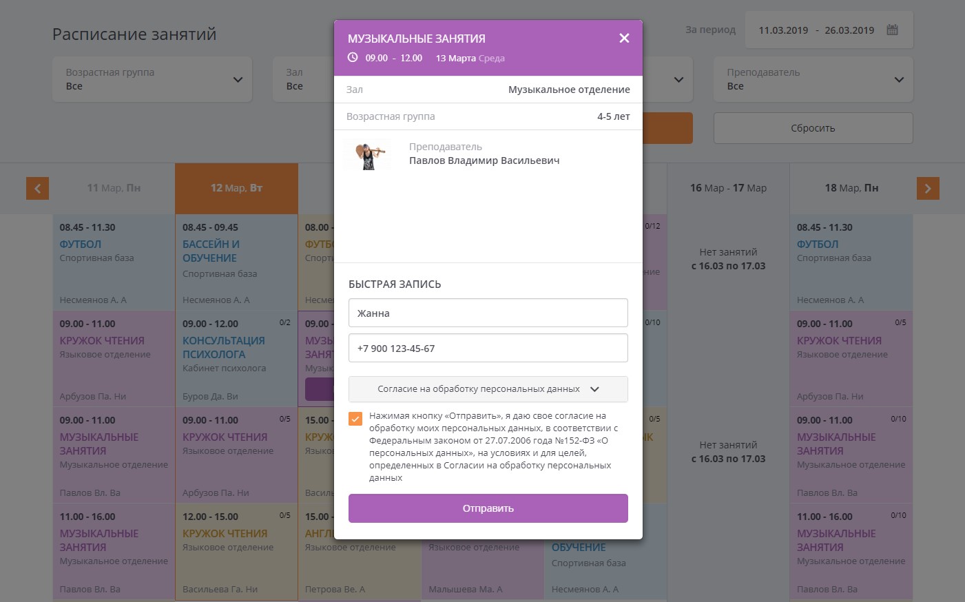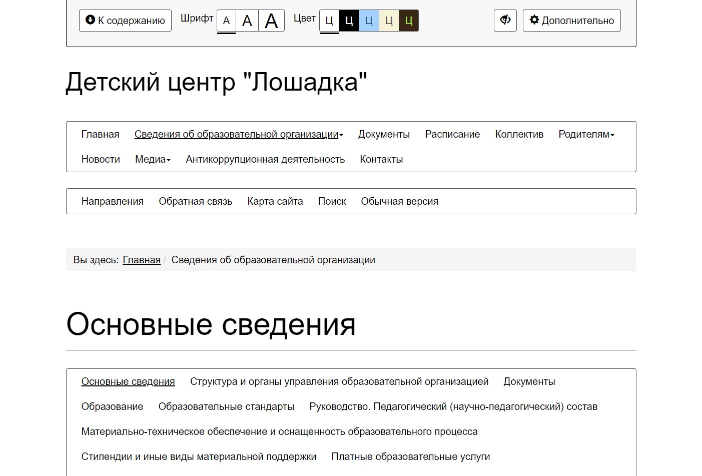 - Для каждого направления предусмотрен собственный раздел со списком преподавателей/воспитателей и расписанием.