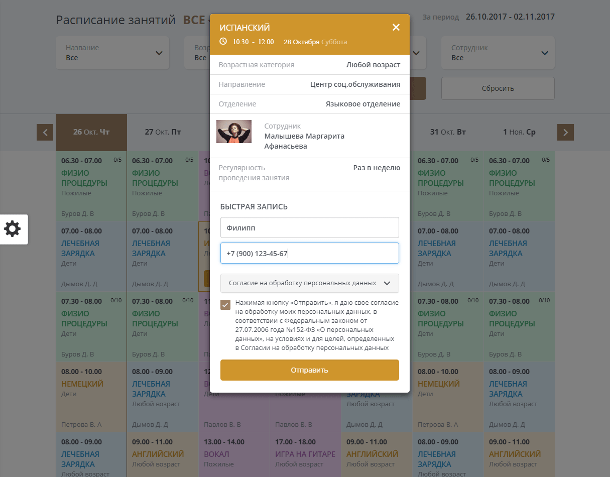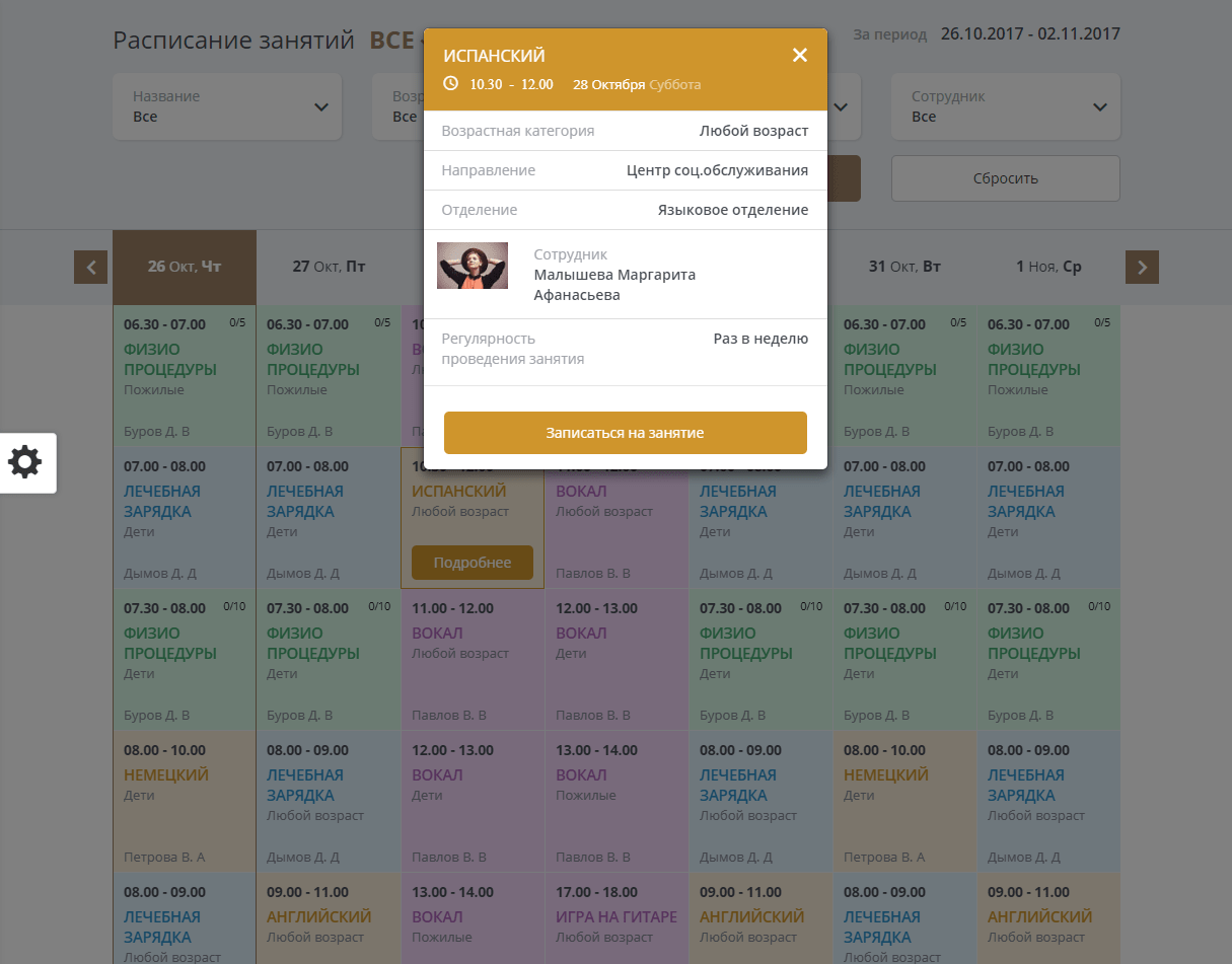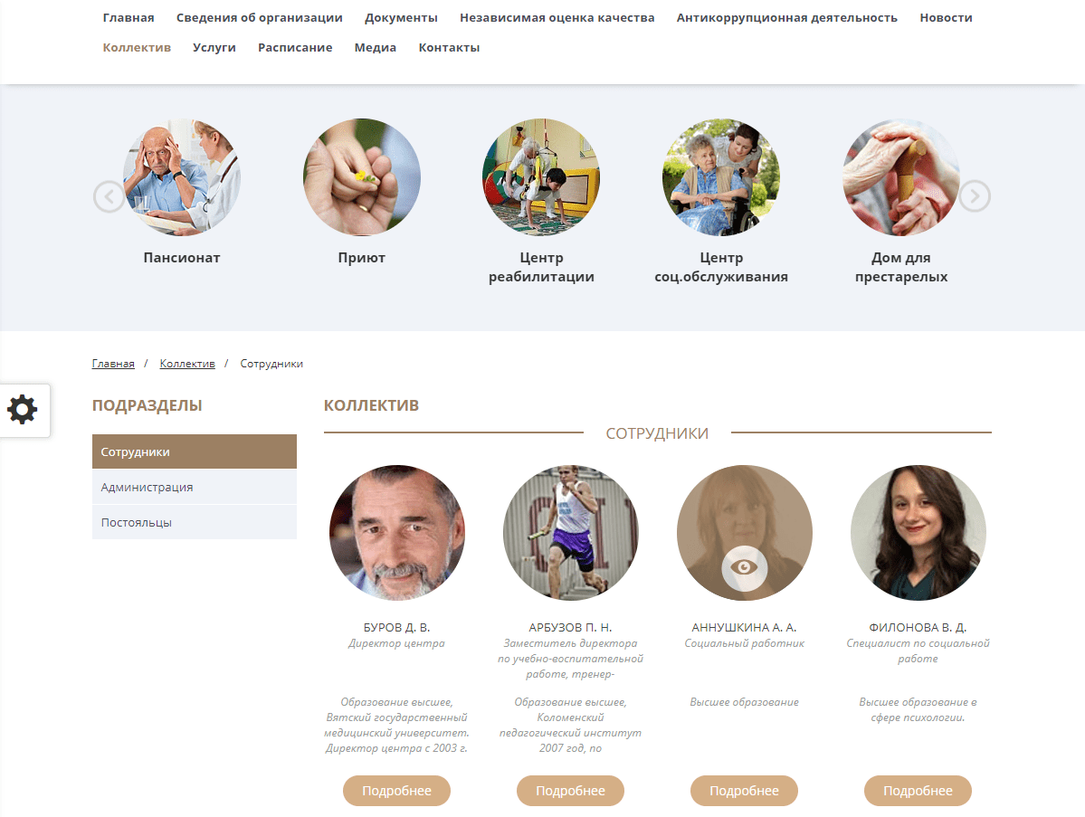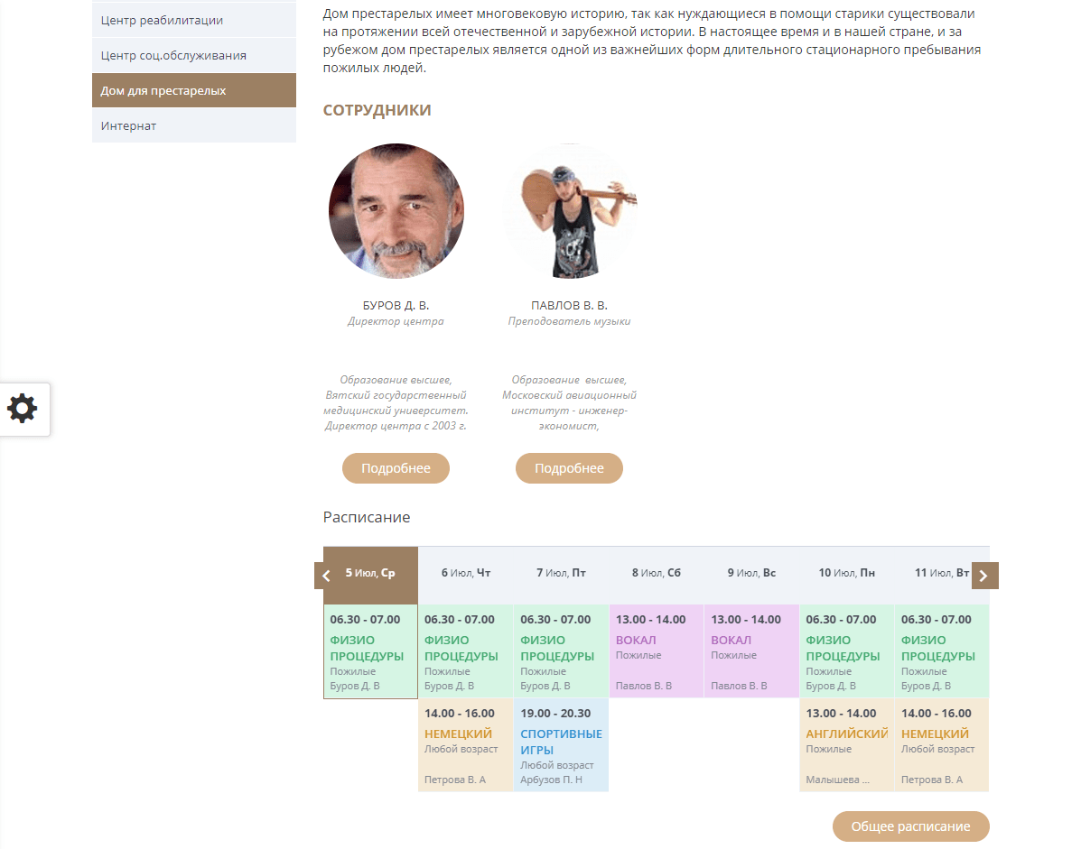 - Для каждого направления деятельности предусмотрен собственный раздел со списком персонала и расписанием.