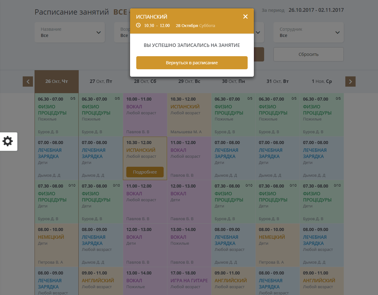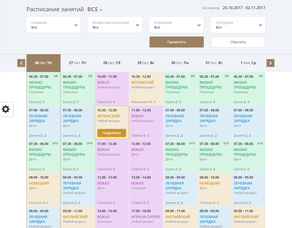 - Модуль расписания позволяющий создать полноценное расписание занятий, процедур с фильтрами по группам, направлениям, сотрудникам и месту проведения.
