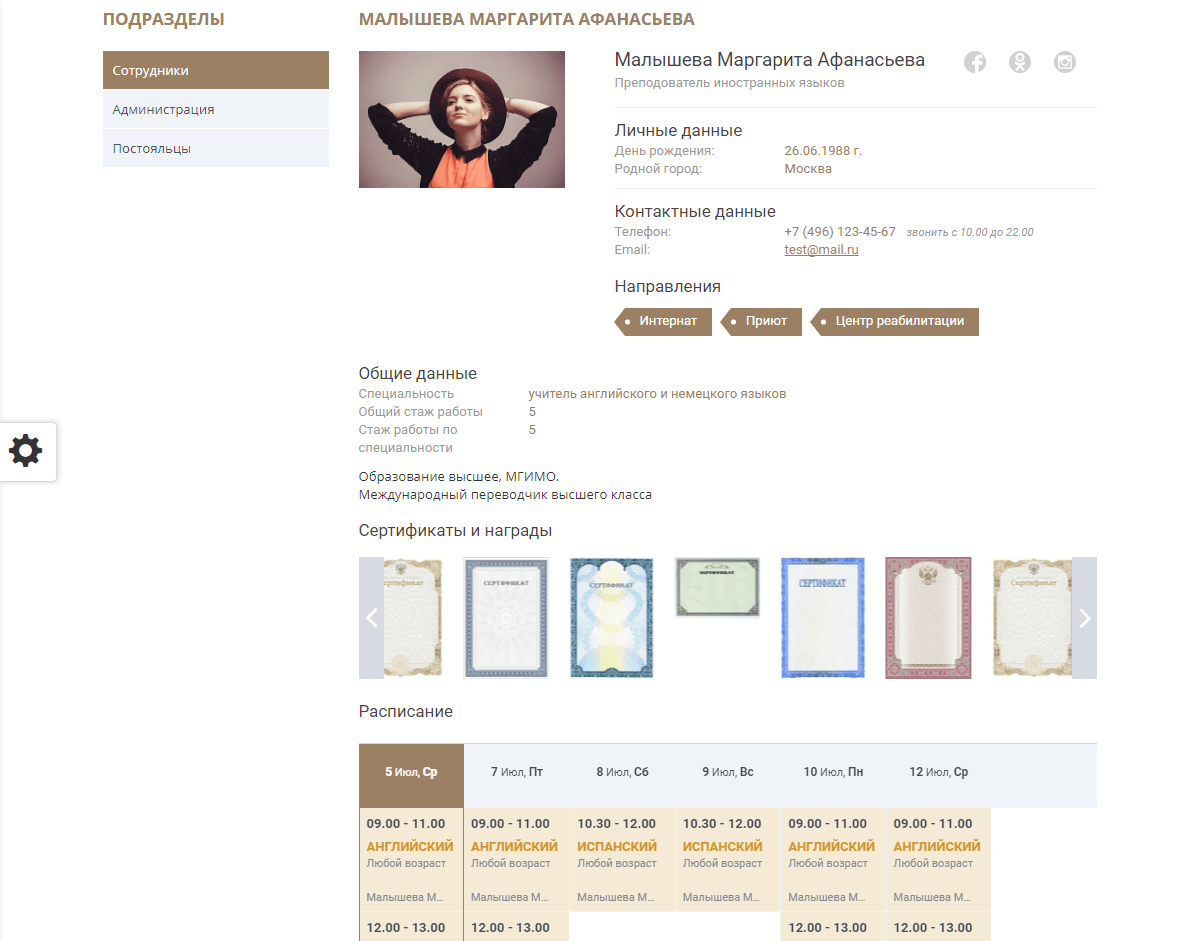 - Личная страница сотрудника (персонала) с его заслугами и наградами, а так же блоком расписания занятий, которые он ведет или датами и временем приёма.