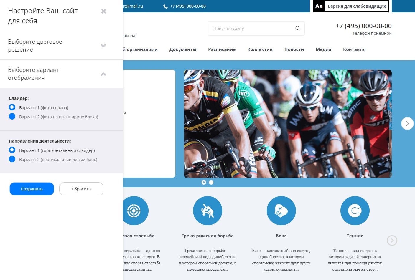 Универсальность Благодаря разработанному функционалу сайта решение легко адаптировать под любую спортивную организацию и любой контент | Адаптивная верстка сайта Позволяет комфортно пользоваться сайтом, как на смартфоне и планшете, так и на ноутбуке и ПК | Готовая структура Готовая структура с демо-материалами для быстрого запуска позволит запустить сайт за несколько часов. |