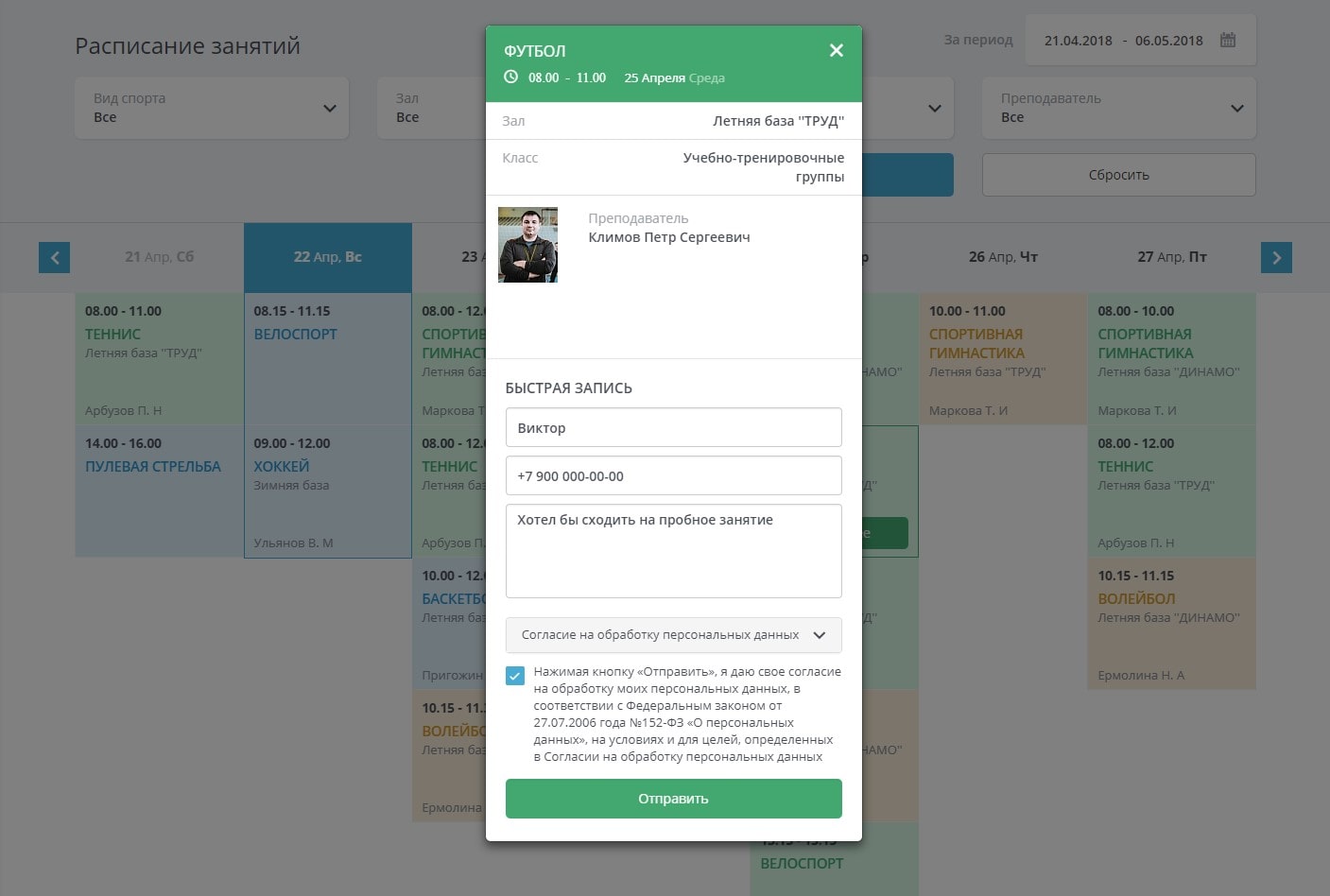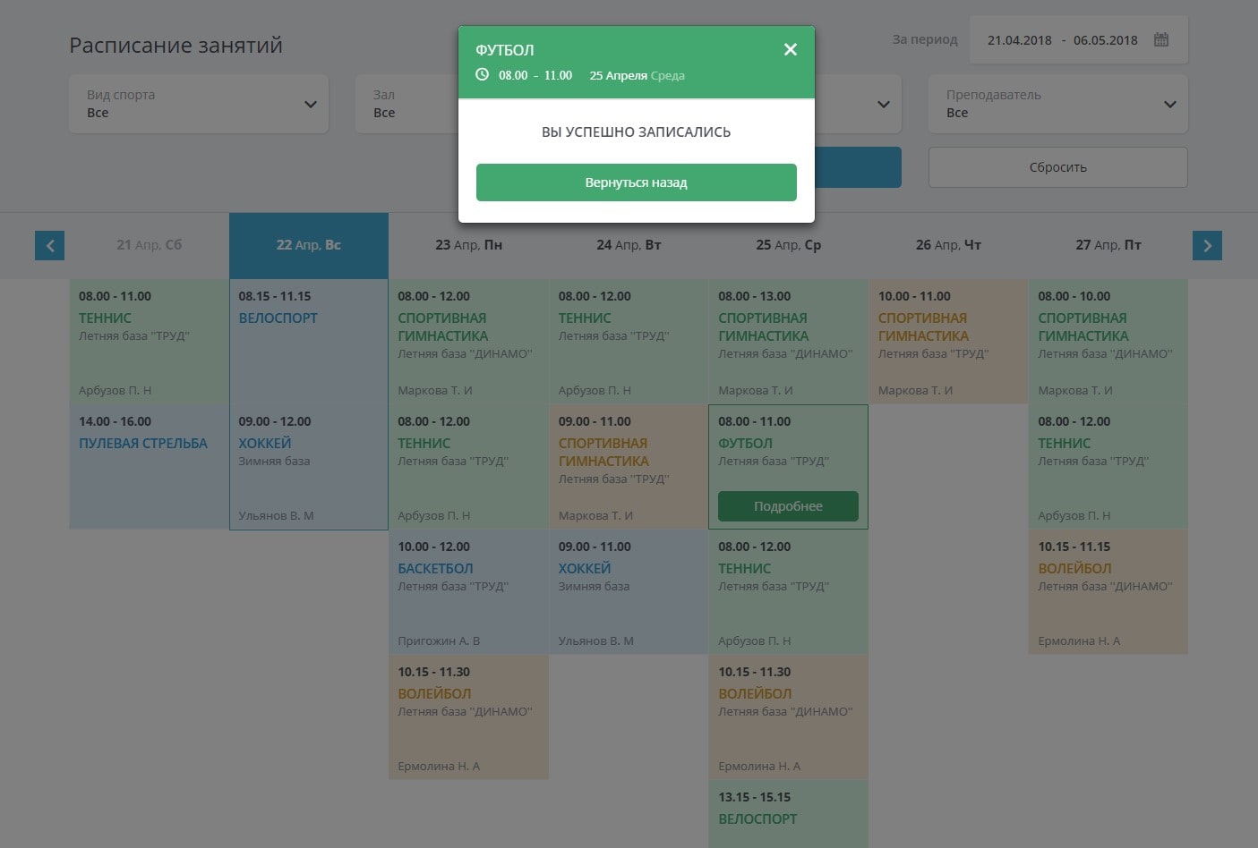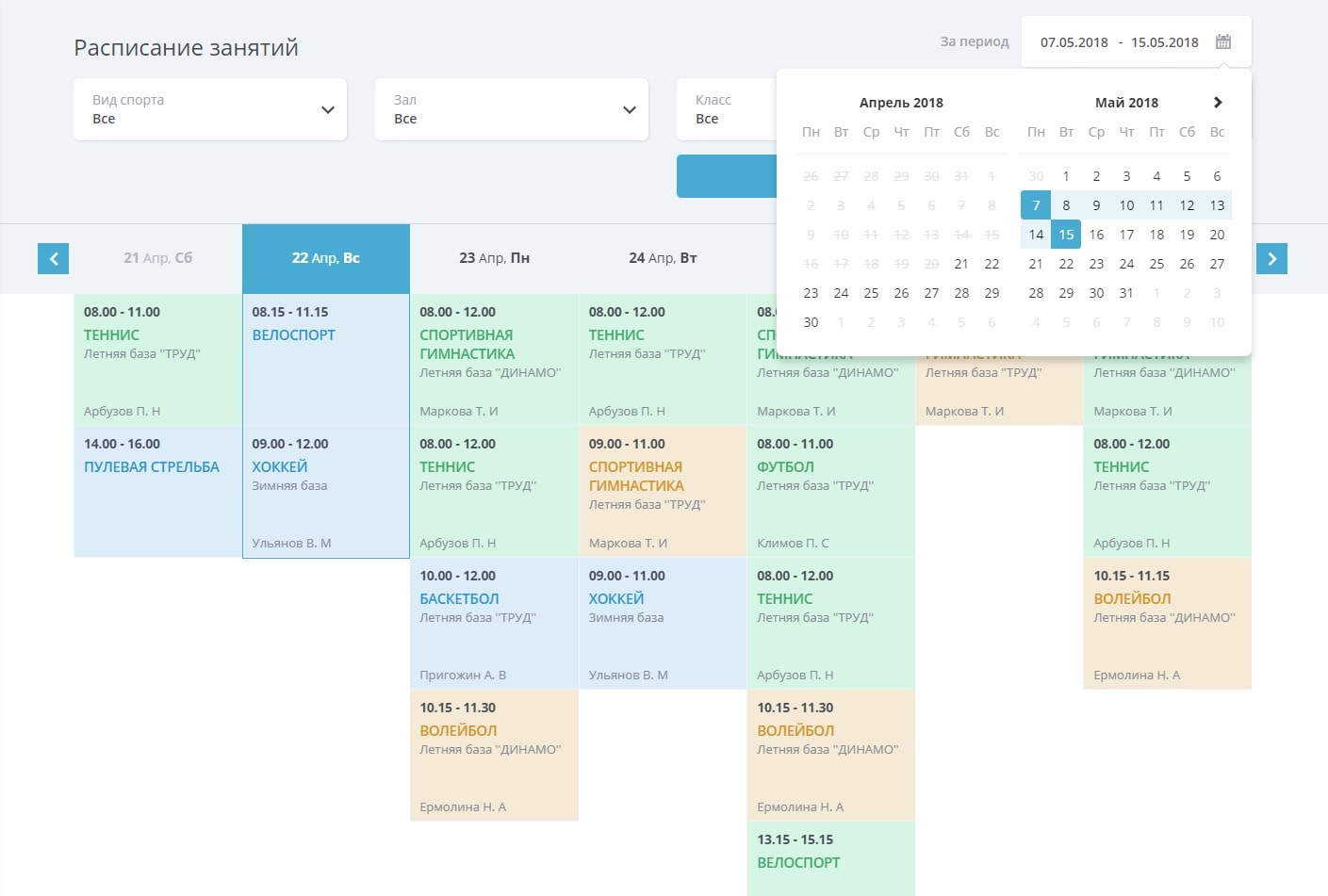 - Модуль расписания позволяющий создать полноценное расписание занятий с фильтрами по классам (группам), направлениям (видам спорта), преподавателям (тренерам) и месту проведения.