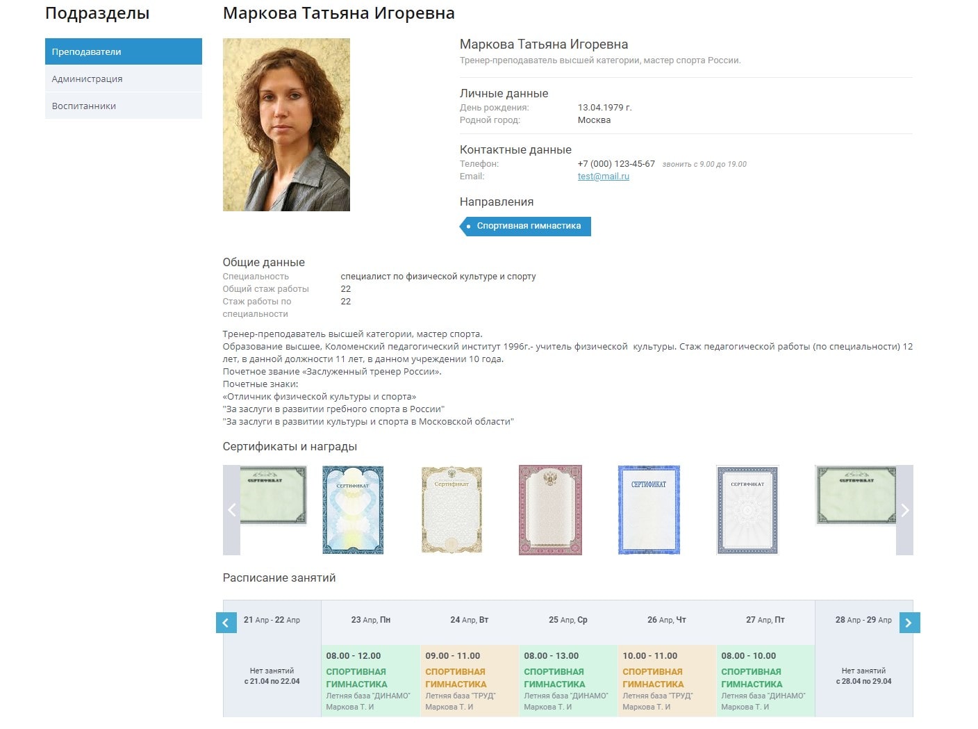 - Личная страница каждого преподавателя (тренера) с его заслугами и наградами, а так же блоком уроков (расписания), которые он ведет.