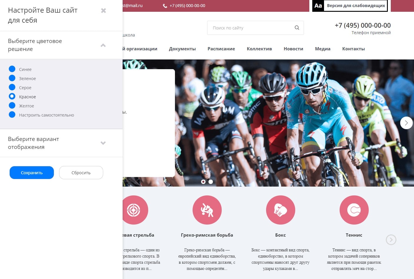Современная спортшкола в современном дизайне. Адаптивная верстка для использования сайта спортшколы на любых устройствах, множество персональных настроек.