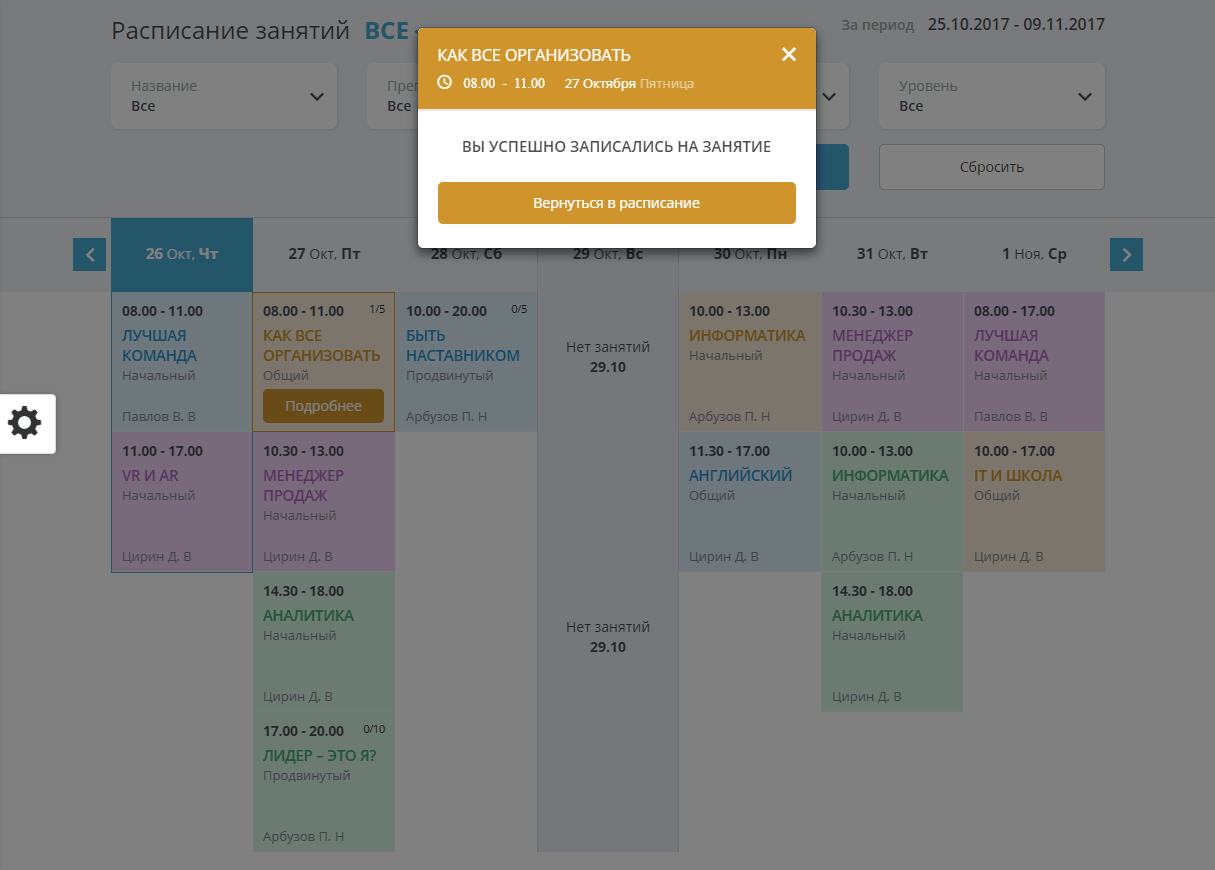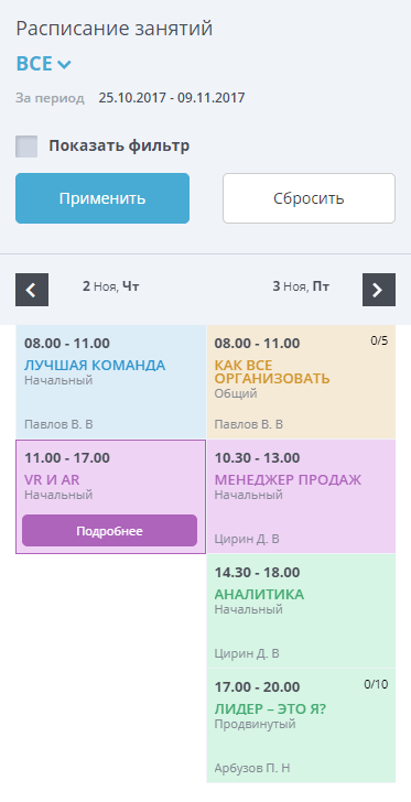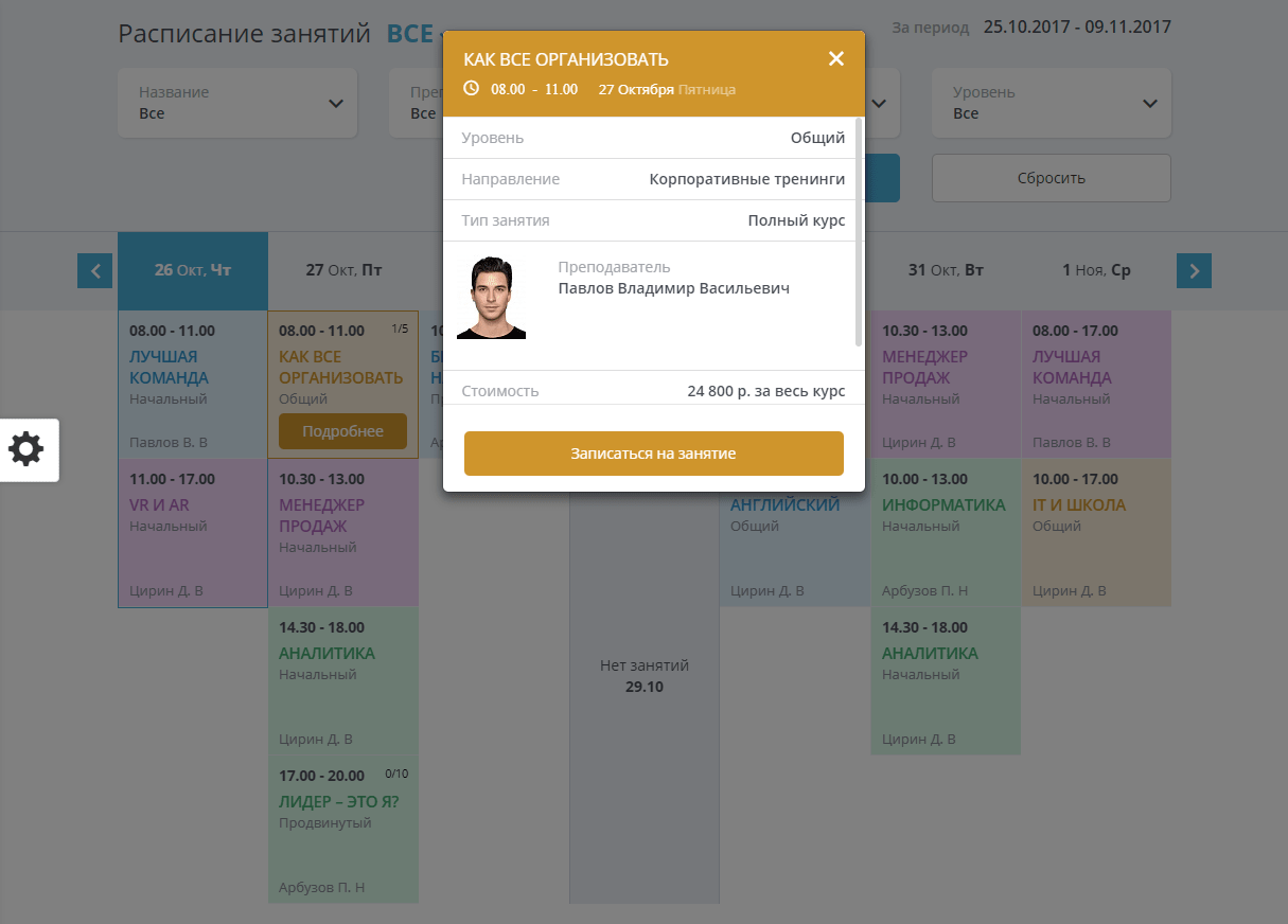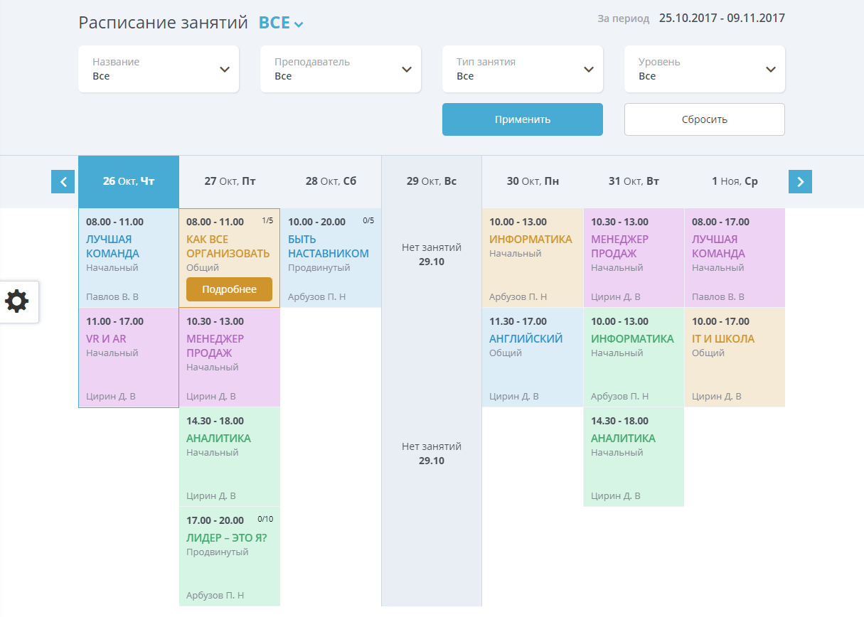 - Модуль расписания позволяющий создать полноценное расписание тренингов, семинаров, занятий с фильтрами по группам, уровням, направлениям, преподавателям.