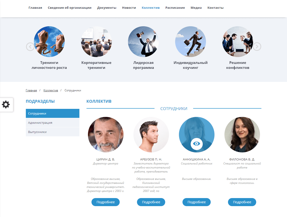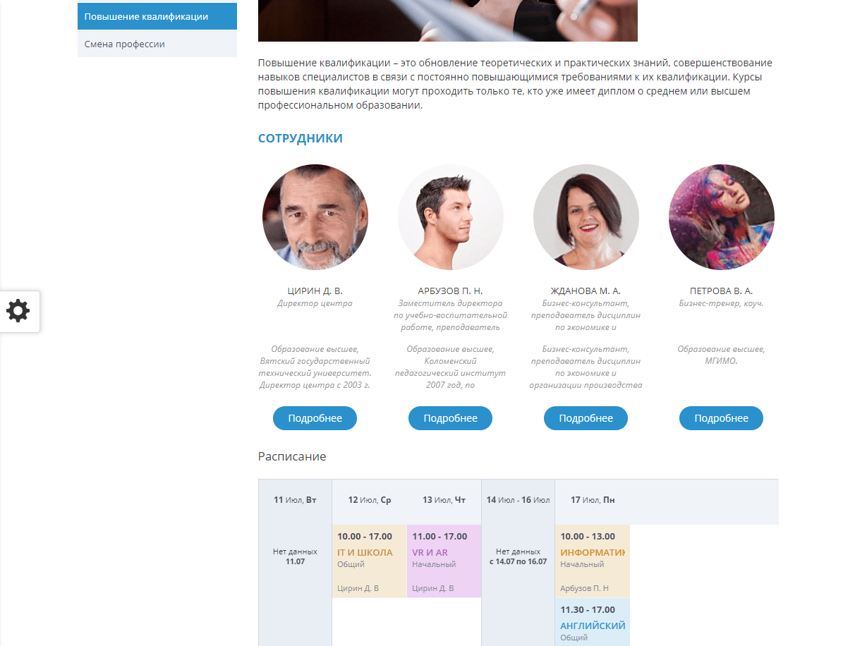 - Для каждого направления деятельности предусмотрен собственный раздел со списком преподавателей и расписанием.