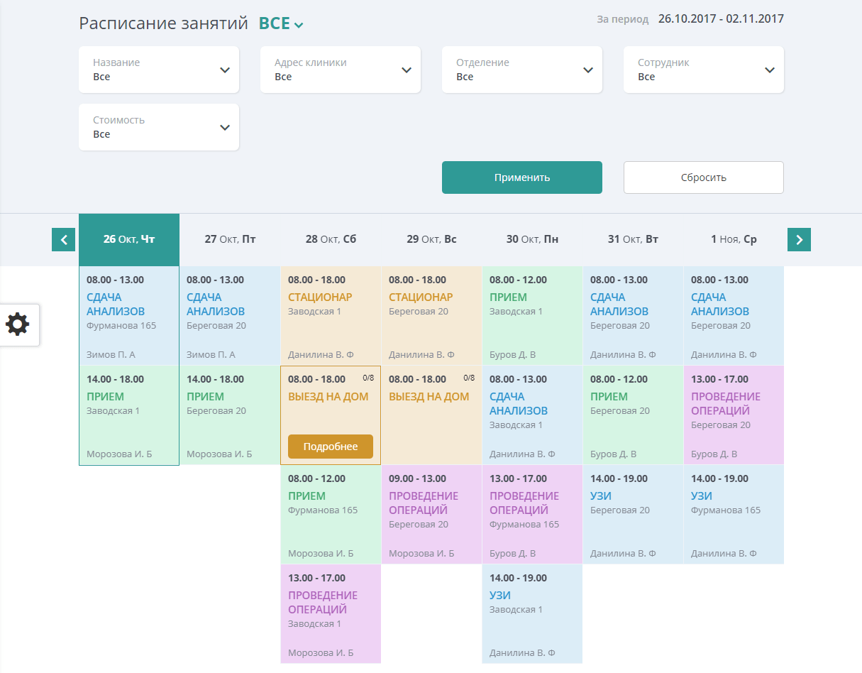 - Модуль расписания позволяющий создать полноценное расписание приема ветеринаров.