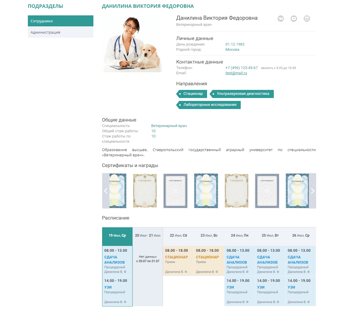 - Личная страница каждого ветеринара с заслугами и наградами, а так же блоком расписания приема, которые он ведет.