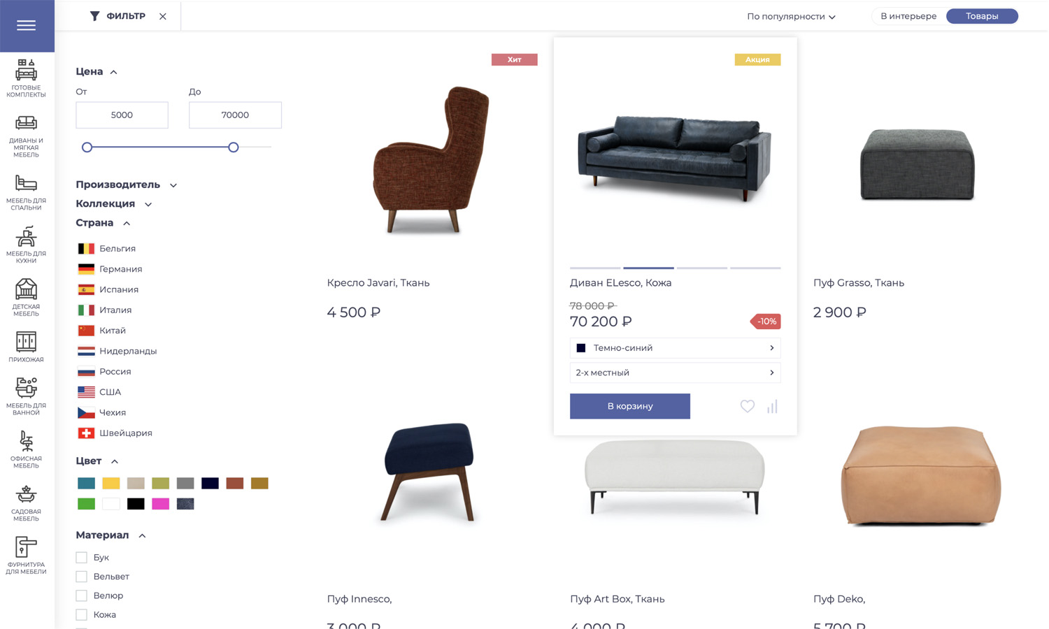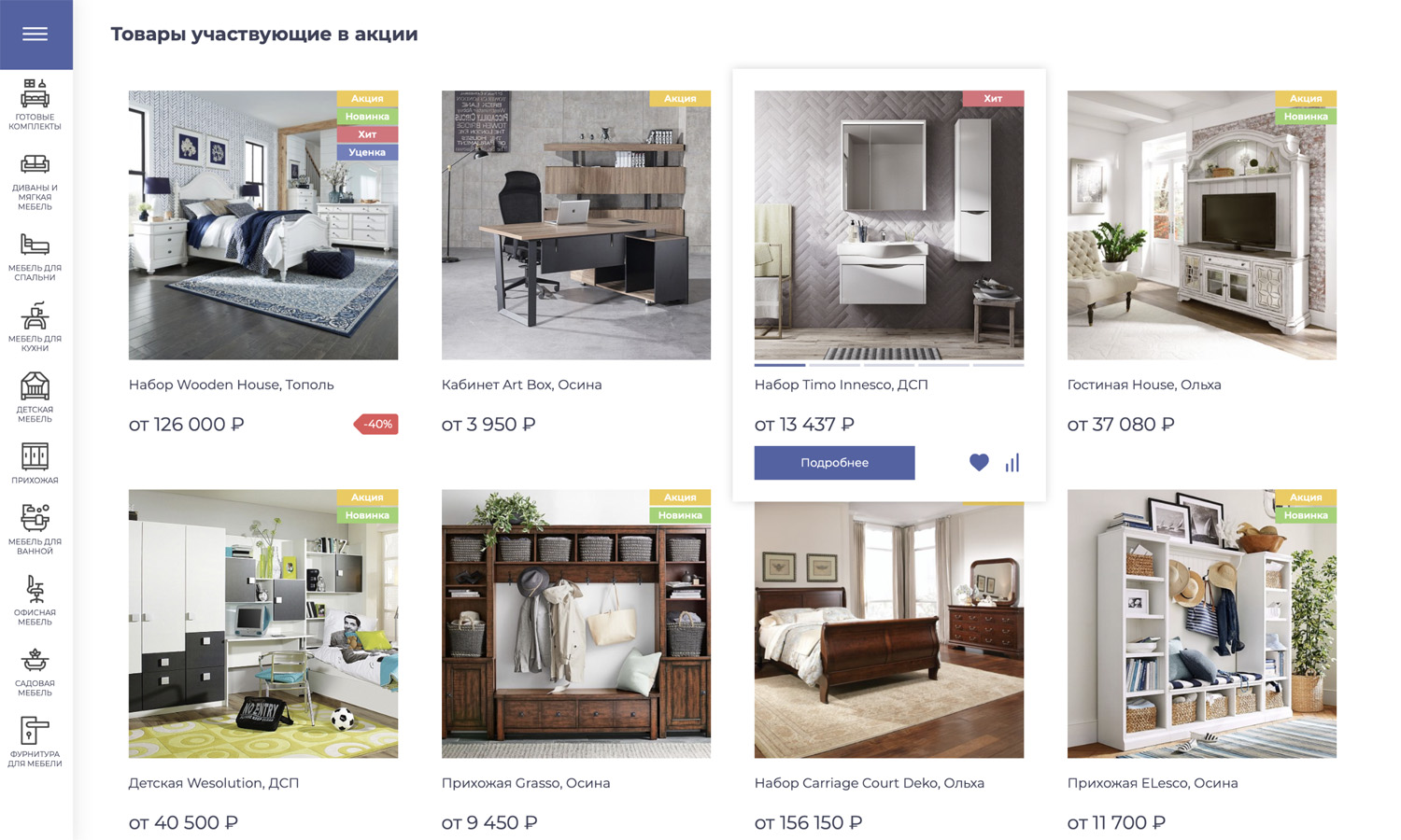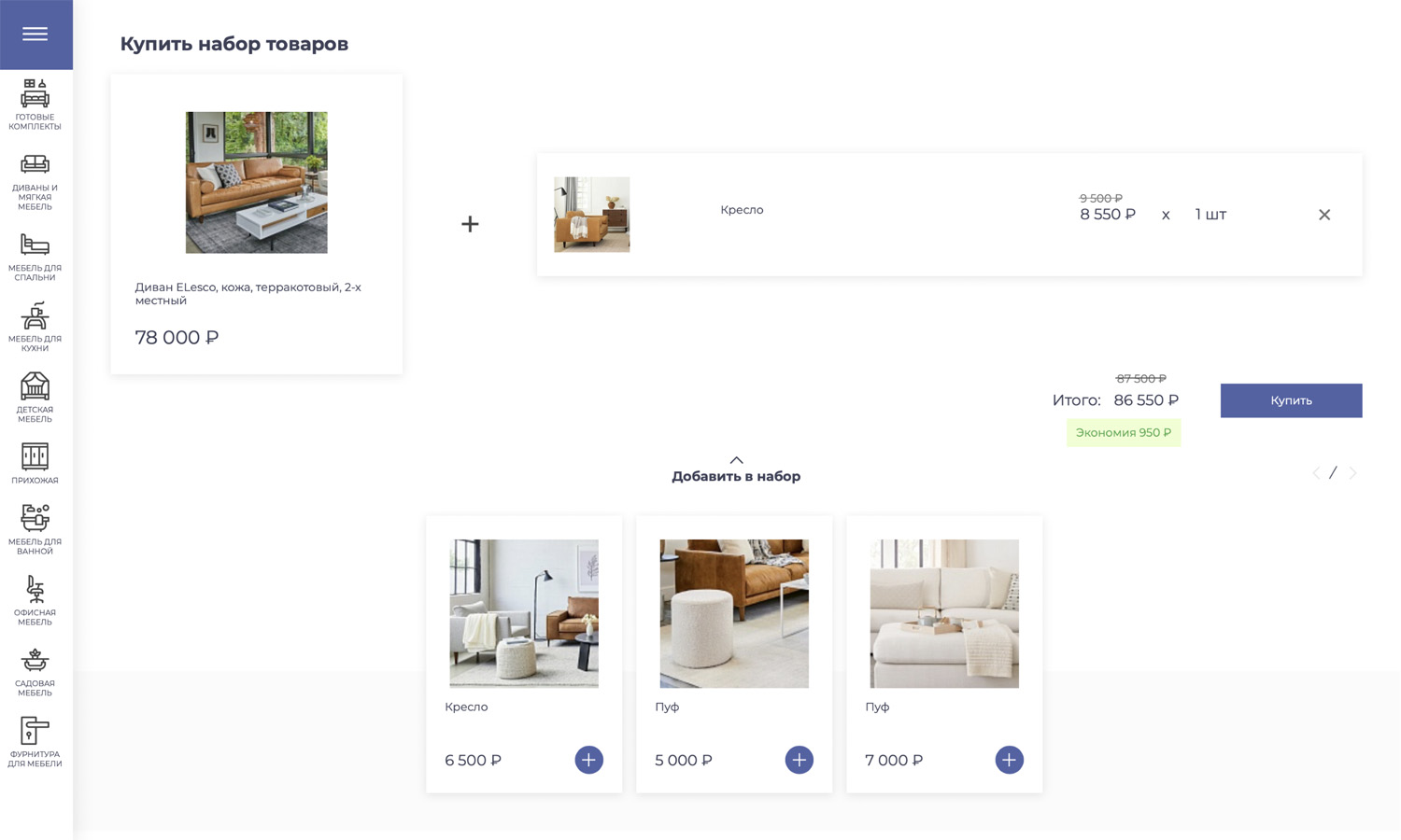 (кухни, гостиные, спальни, кабинеты и др.) или взаимодополняющих товаров (диван, кресло и пуфик и т.п.)
