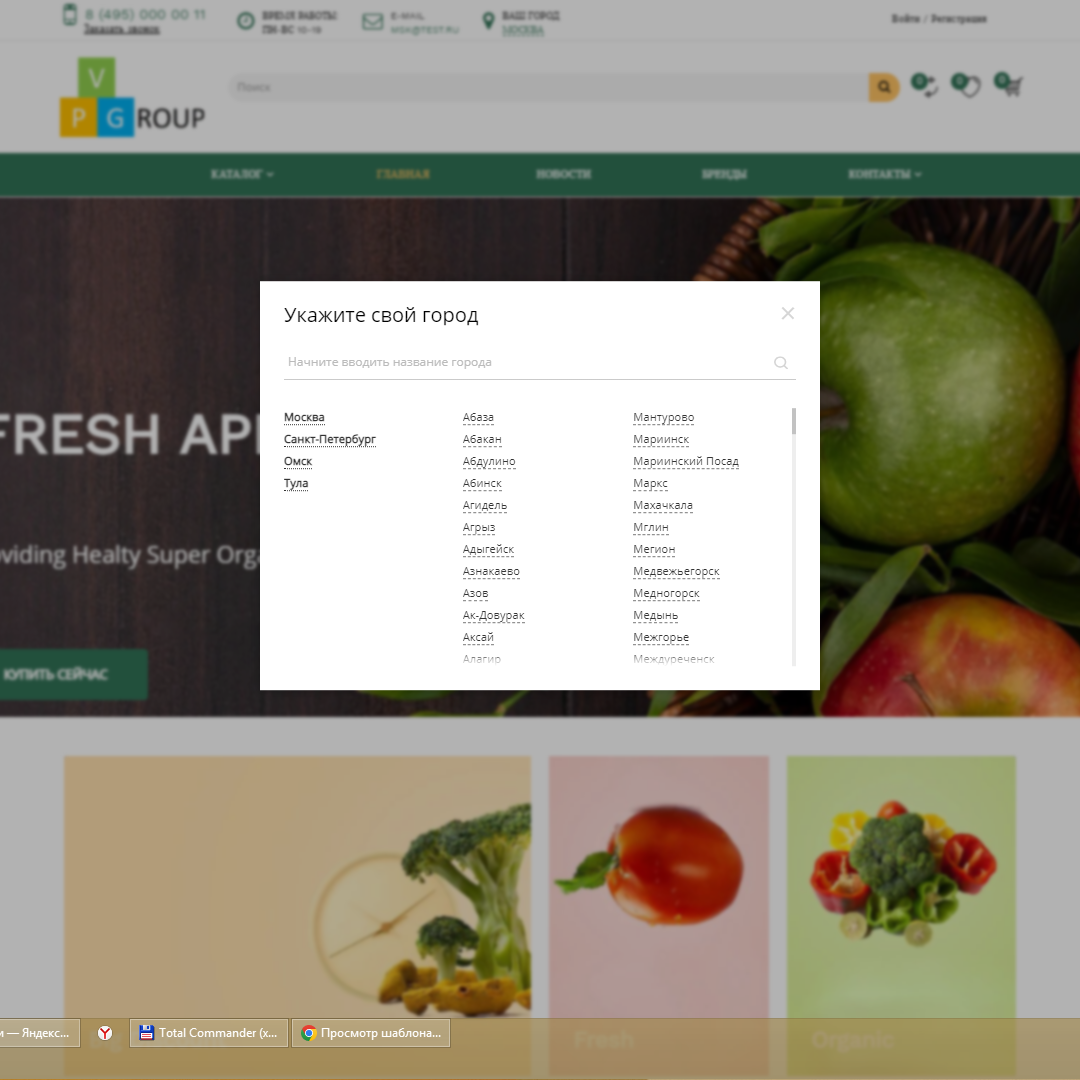 - Определение города по IP адресу и возможность выбора города из списка в удобном и стильном всплывающем окне.