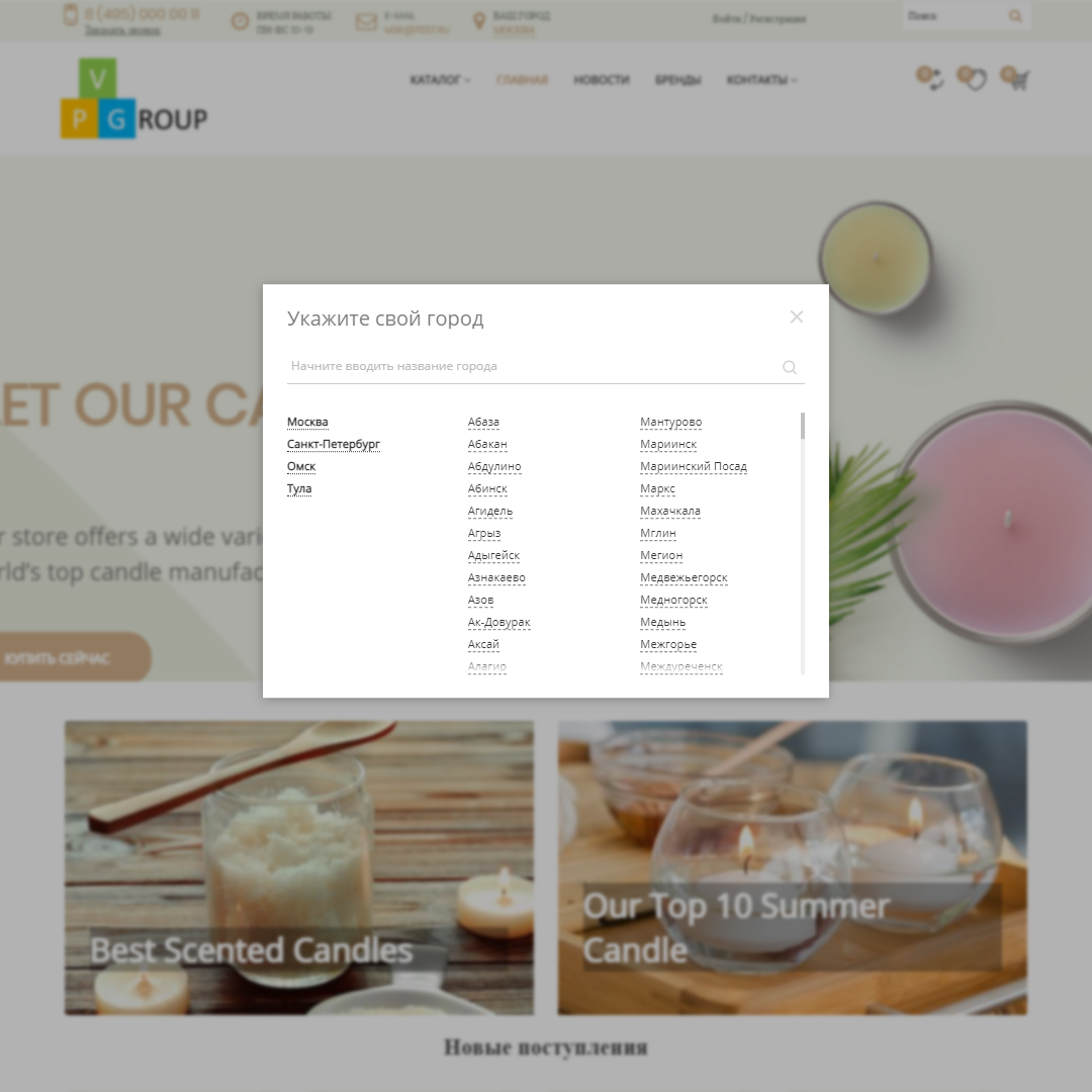 - Определение города по IP адресу и возможность выбора города из списка в удобном и стильном всплывающем окне.