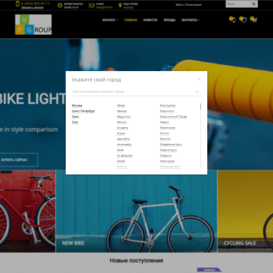 - Определение города по IP адресу и возможность выбора города из списка в удобном и стильном всплывающем окне.