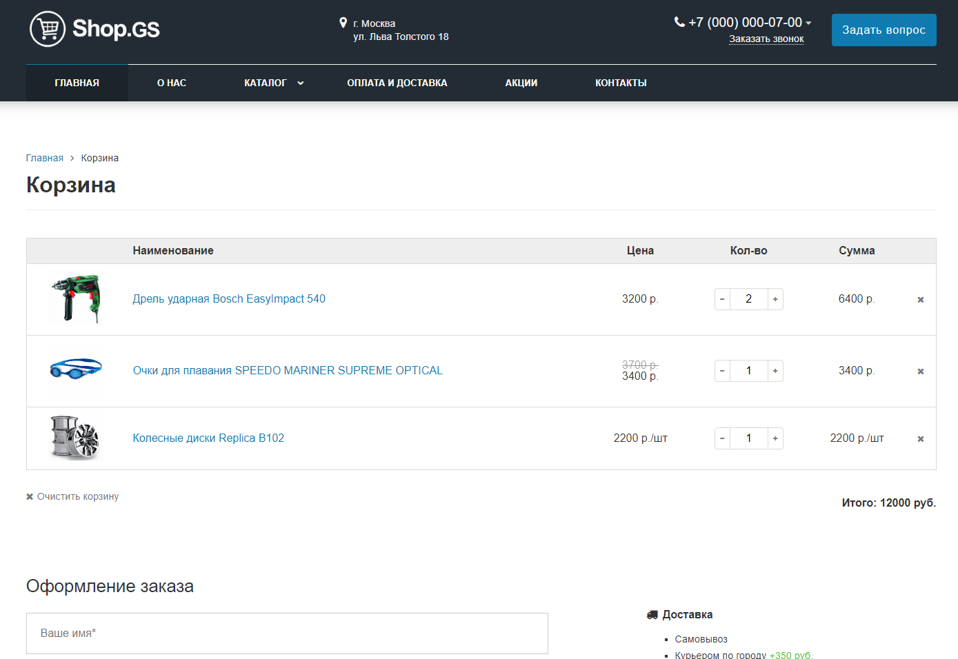 Корзина с каталогом. Данный функционал работает на редакции Битрикс Старт и выше. При необходимости корзину можно отключить.