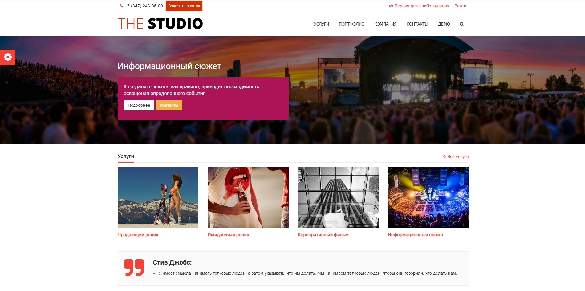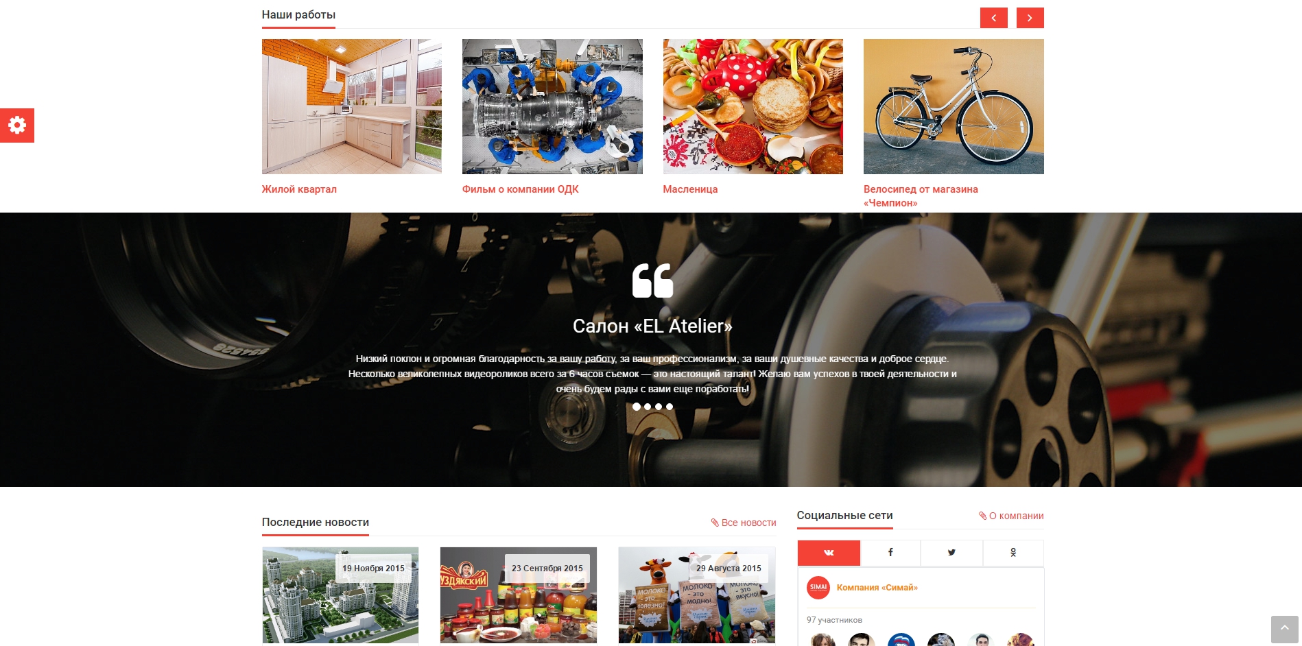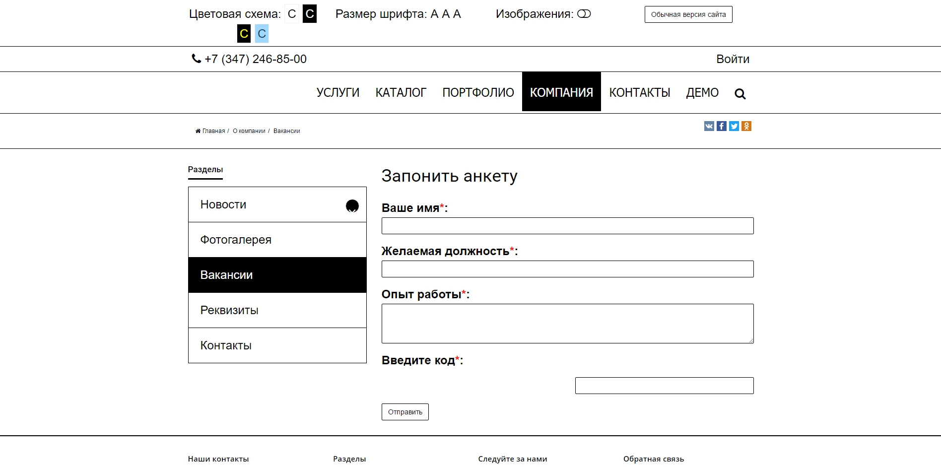 - Большие информационные возможности: каталог продукции, подробное описание услуг компании, новости, вакансии, фотогалерея.