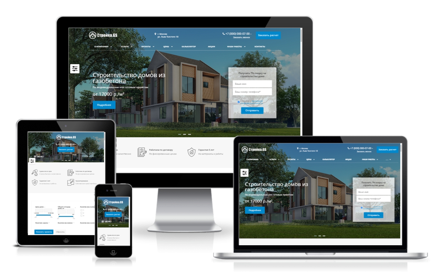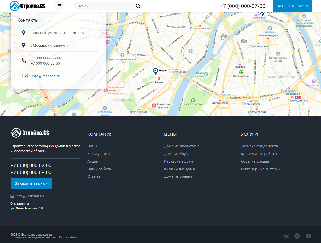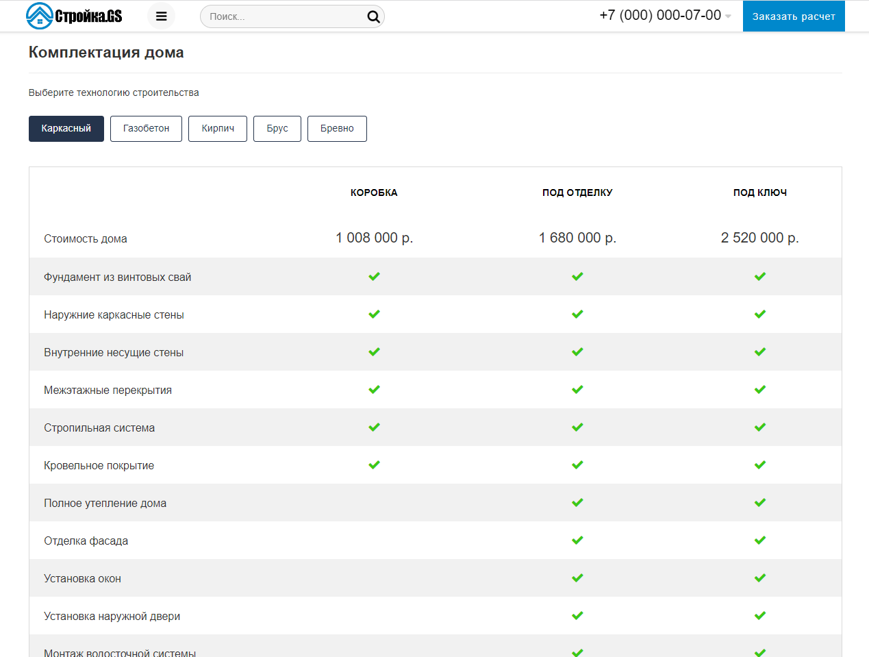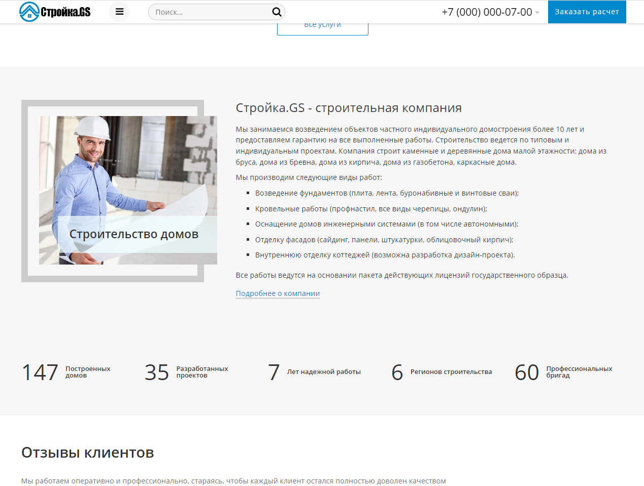 «Стройка.GS - сайт строительной компании» – универсальный, адаптивный сайт для компаний оказывающих услуги в строительной сфере. Возможная интеграция: заливка фундаментов, устройство кровли, бурение скважин, ландшафтный дизайн, установка септиков, монтаж водяных теплых полов, строительство домов, строительство бань, строительство беседок, строительство гаражей, строительство барбекю (камины, печи), архитектурное бюро, малоэтажное строительство, строительство коттеджей, проектирование малоэтажных домов, проекты домов, строительные материалы.