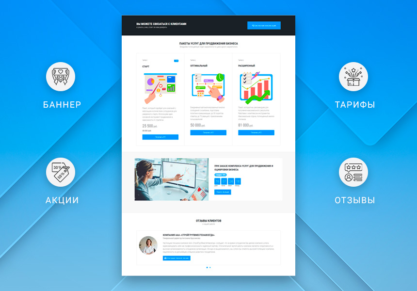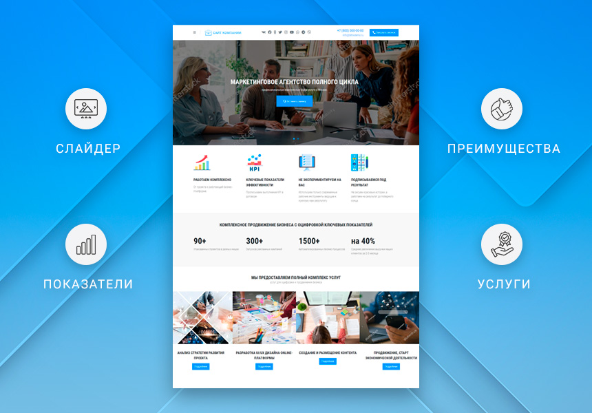 Готовое решение для быстрого запуска сайта для компании в сфере оказания услуг. Благодаря готовому решению Вы легко и быстро сможете запустить свой сайт в интернете, для этого вам нужно только наполнить сайт Вашей информацией.