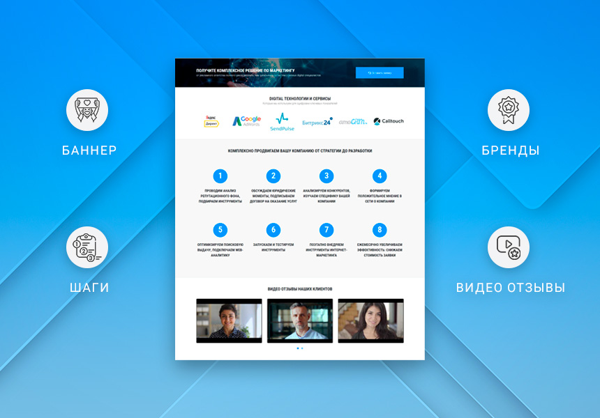 Отзывы — один из важных блоков доверия. Попросите ваших клиентов написать несколько строк о результатах использования ваших услуг. Не используйте фальшивые отзывы, их всегда видно.