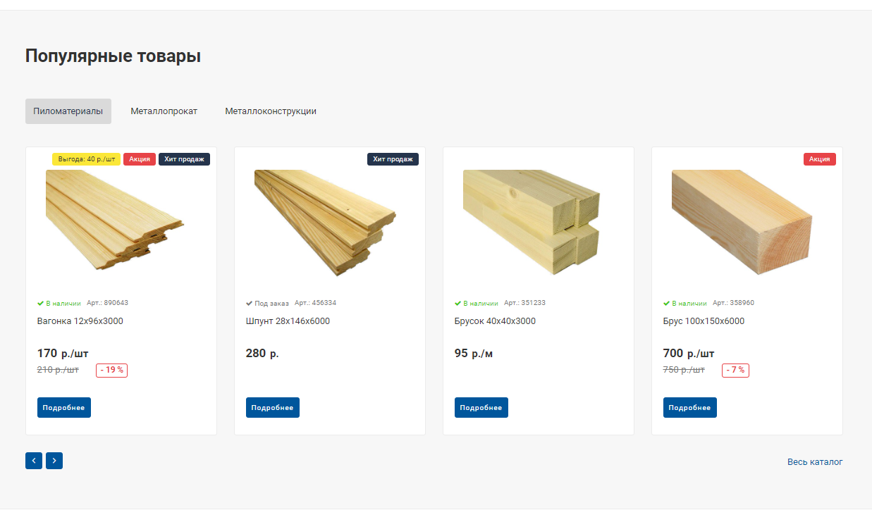 Перелинковка. Широкая перелинковка за счет вывода пагинации в виде раскрытого списка на разделы и подразделы, а также вывода популярных товаров на детальных страницах услуг и каталога.