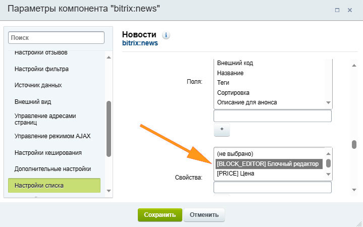 - Для компонента Список новостей добавляет возможность выводить свойства блочного редактора в каждом элементе списка новостей