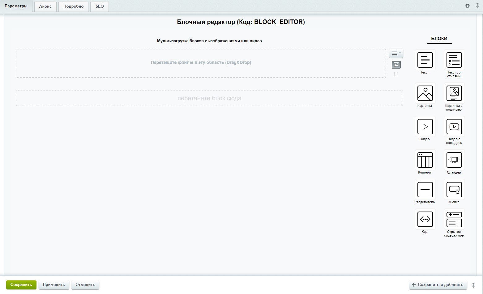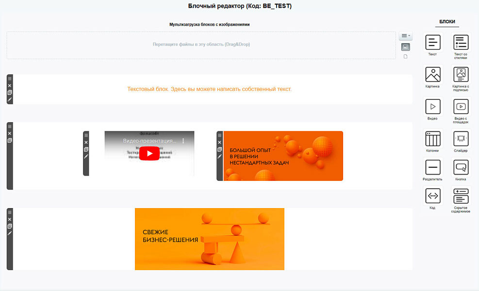 «Блочный редактор» разработан с целью предоставить контент-менеджеру удобный инструмент добавления содержимого в элемент инфоблока, преимущество такого подхода по сравнению с визуальным редактором в том, что содержимое собирается в виде конструктора на основе заранее заготовленных блоков.
