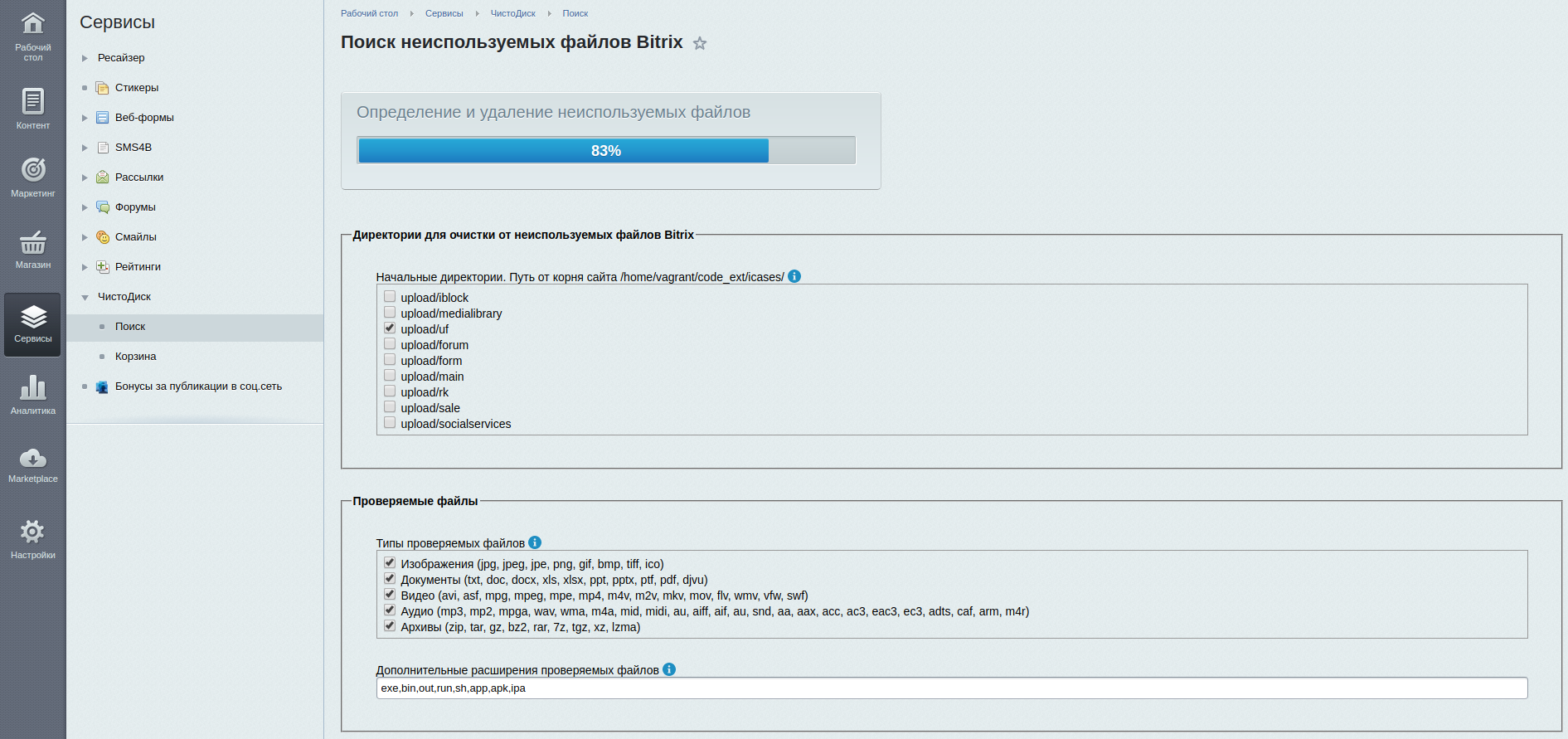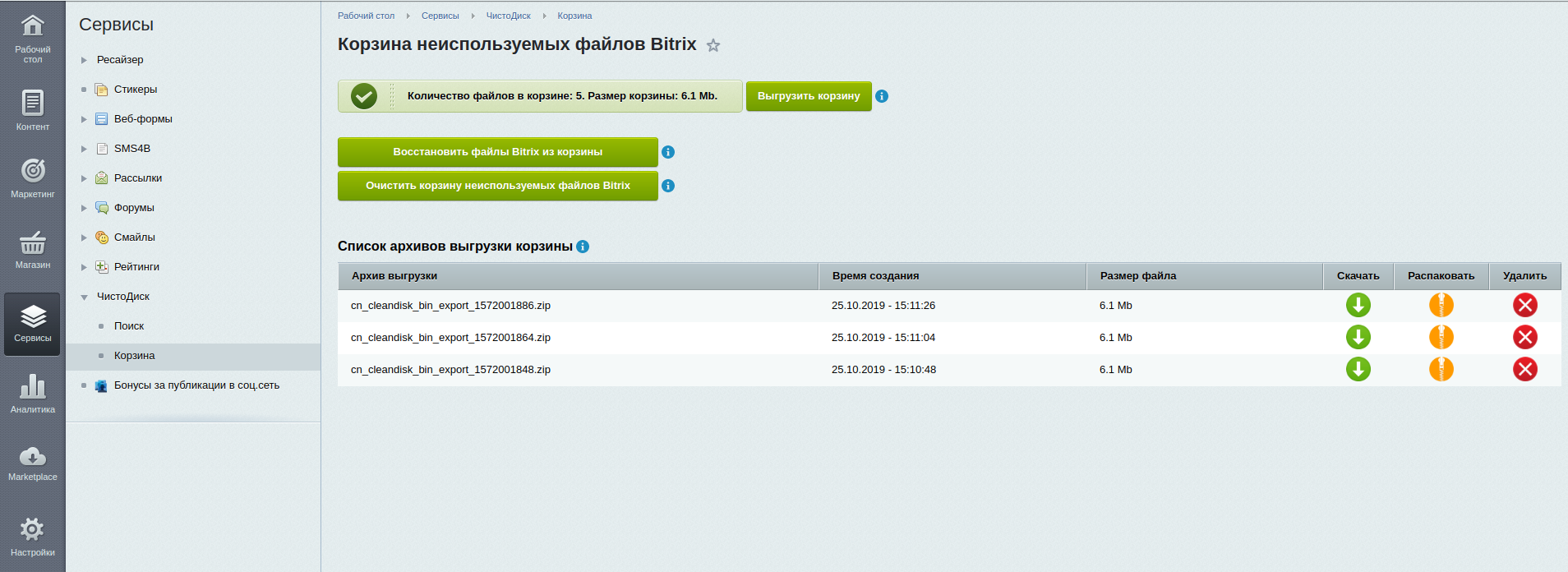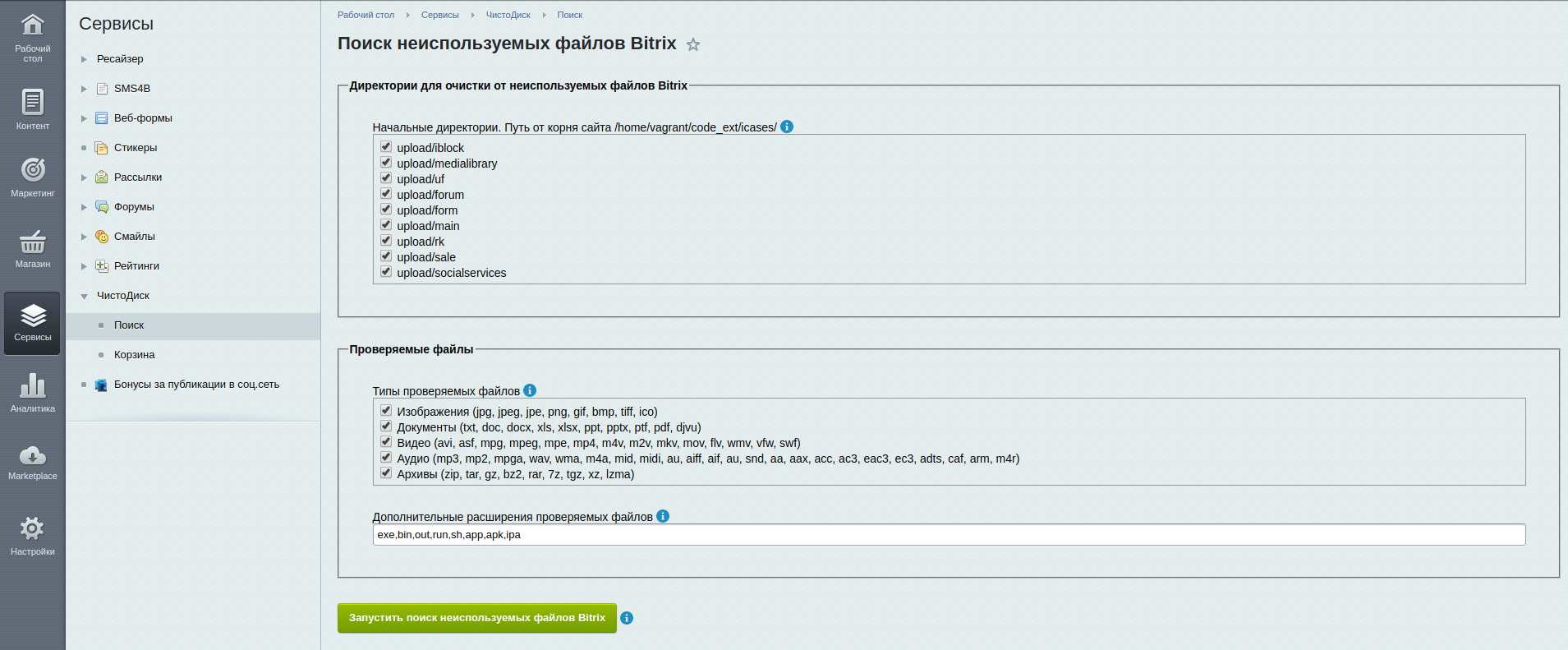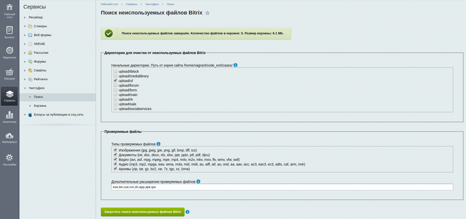 После установки модуля, в разделе "Сервисы" административного меню, будет доступен подраздел "ЧистоДиск" с пунктами "Поиск" и "Корзина".