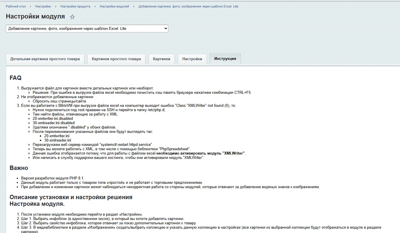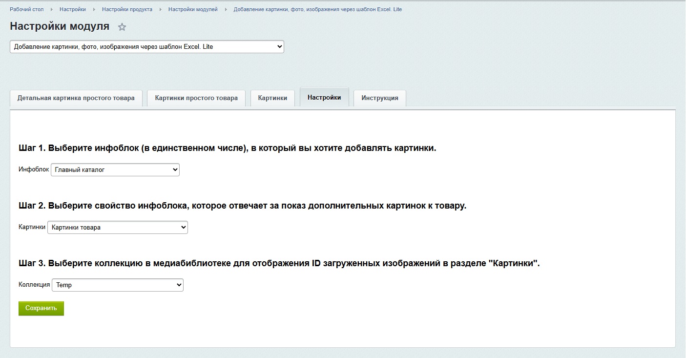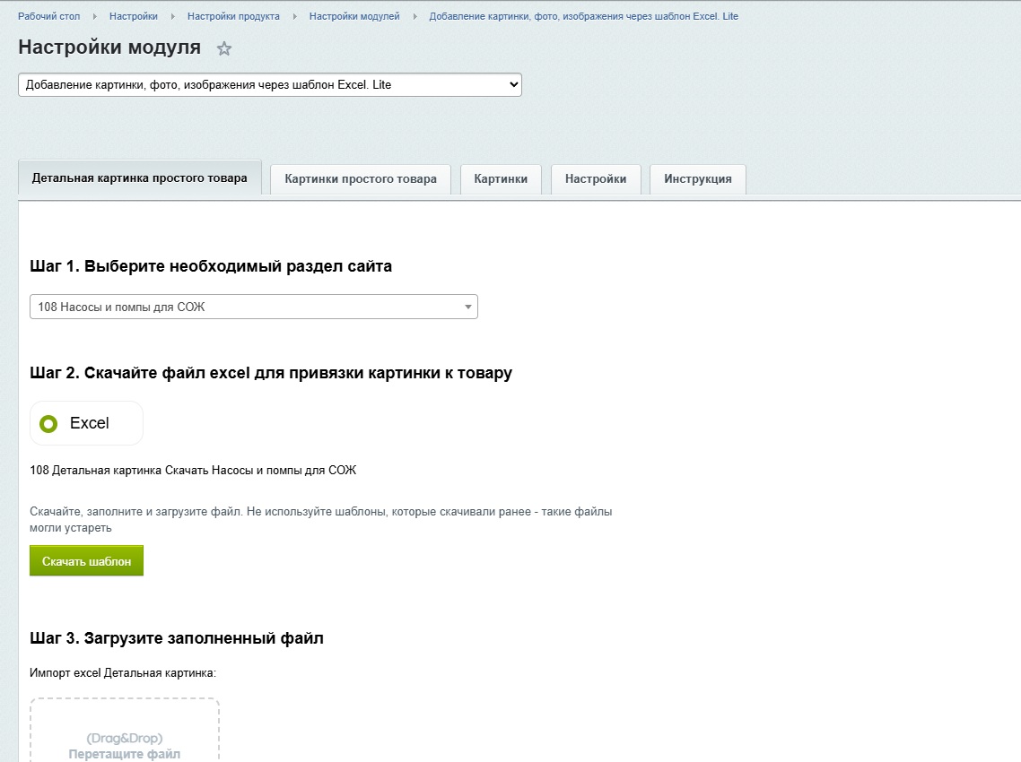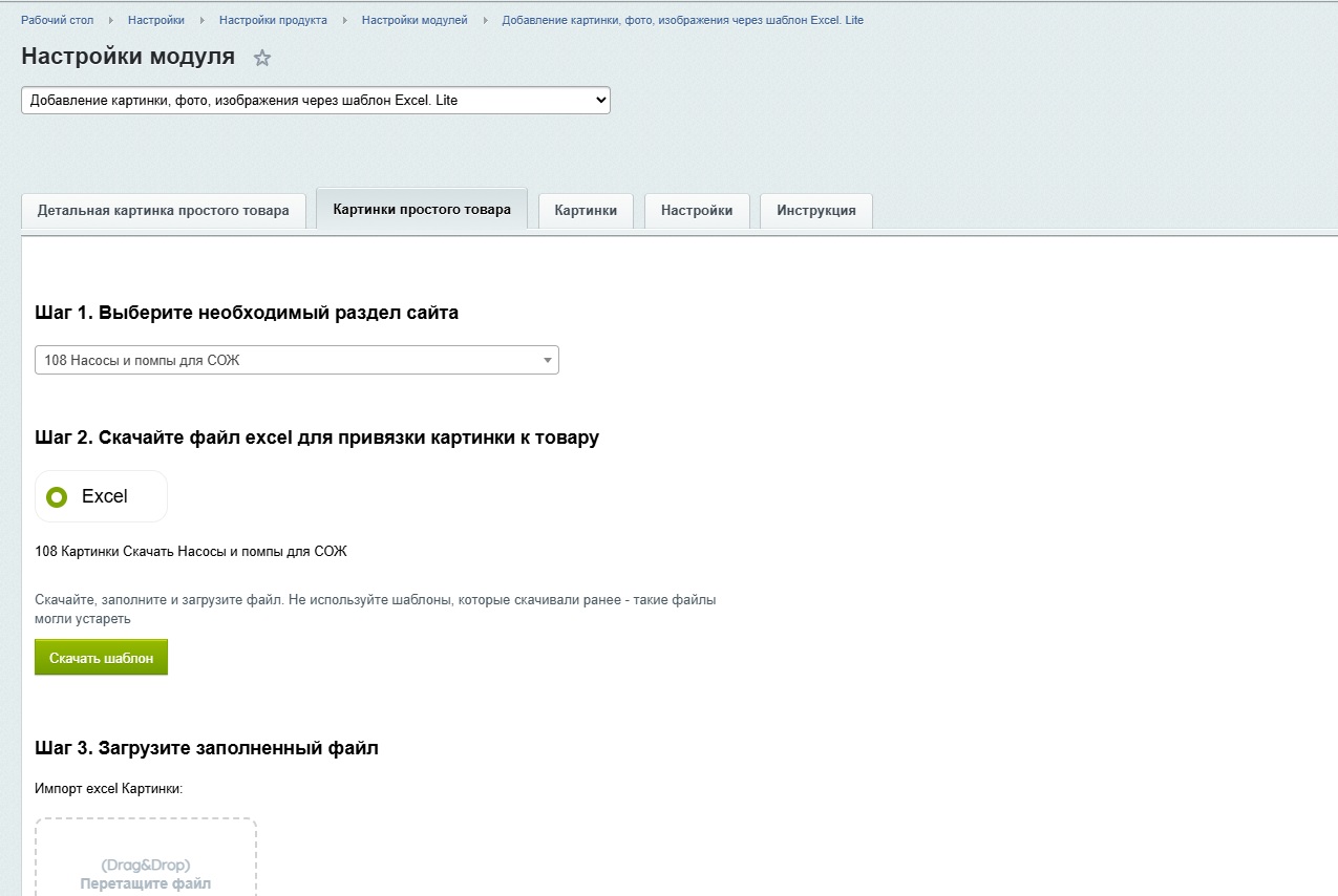 Модуль предназначен для ускоренной загрузки большого числа картинок через шаблон формата excel. Пользователь выбираем нужный раздел сайта и добавляет детальную или простую картинку путем добавления уникальных ID. Картинки для загрузки на сайт должны быть загружены в любую коллекцию в медиабиблиотеке. Модуль работает исключительно с простыми товарами и не предназначен для работы с торговыми предложениями.