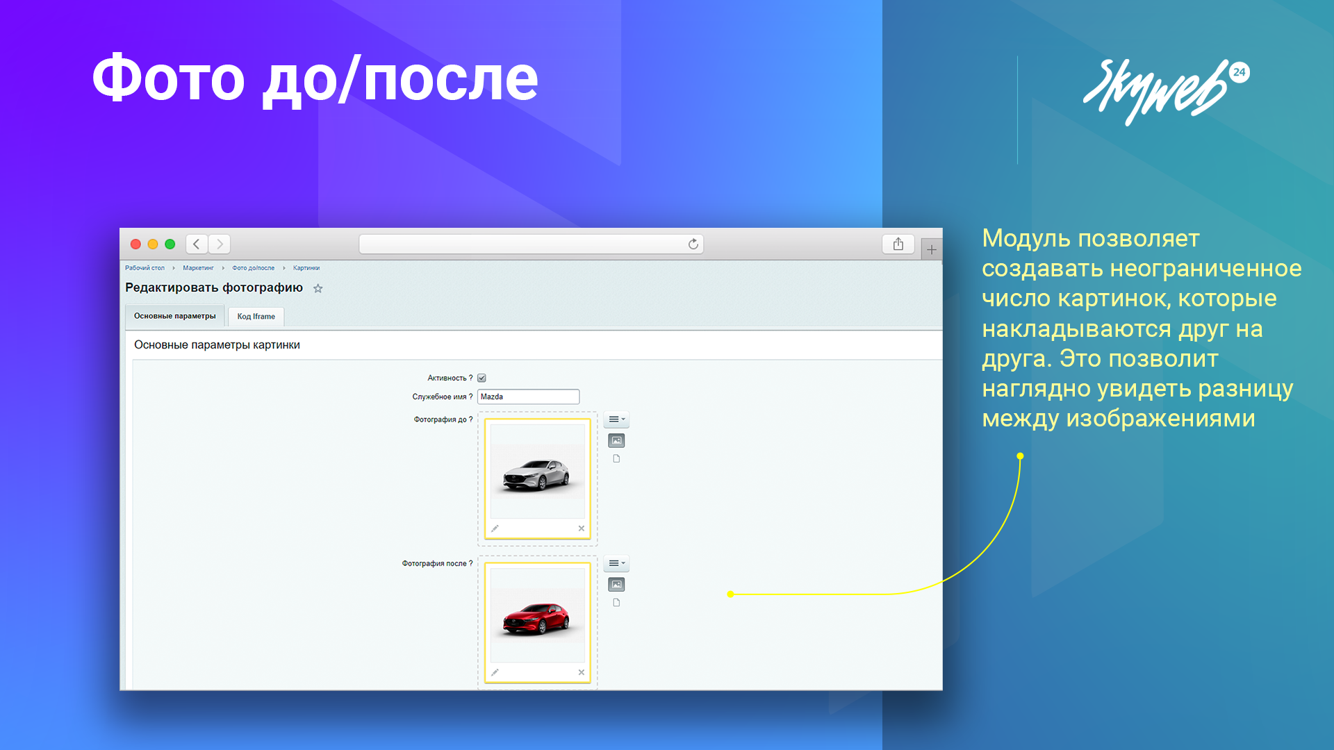 Модуль «Фото до/после» предоставляет пользователям возможность визуально и наглядно продемонстрировать разницу между двумя фотографиями, сделанными до и после выполнения определенной услуги. Благодаря этому модулю, пользователи смогут увидеть реальные результаты и эффекты, достигнутые после определенных процедур, ремонтных работ или изменений.