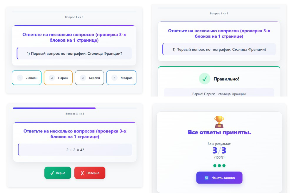 - Интернет-магазины: Для создания викторин по продуктам, опросов для подбора товара или проверки знаний сотрудников.
