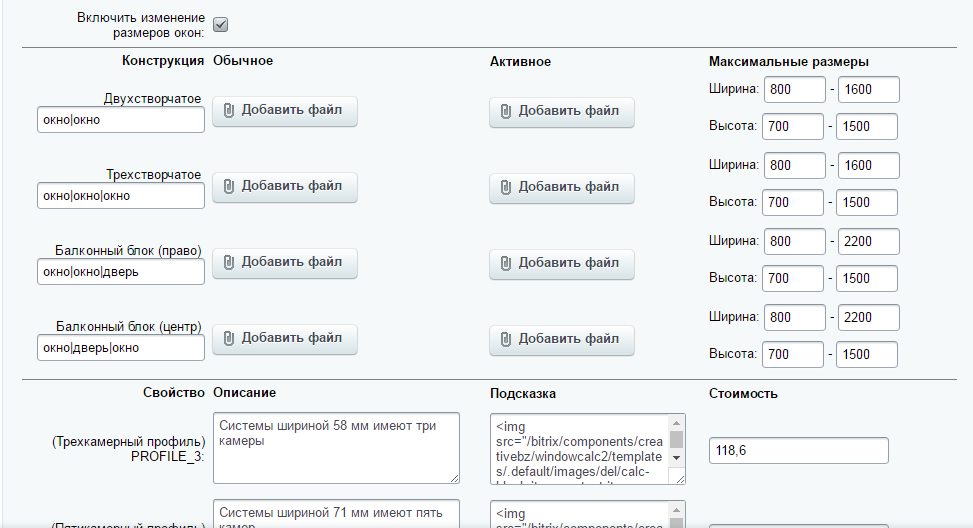 Цены за погонный метр профиля, квадратный метр стеклопакета, всплывающие подсказки и названия дополнительных услуг можно изменять в настройках модуля.