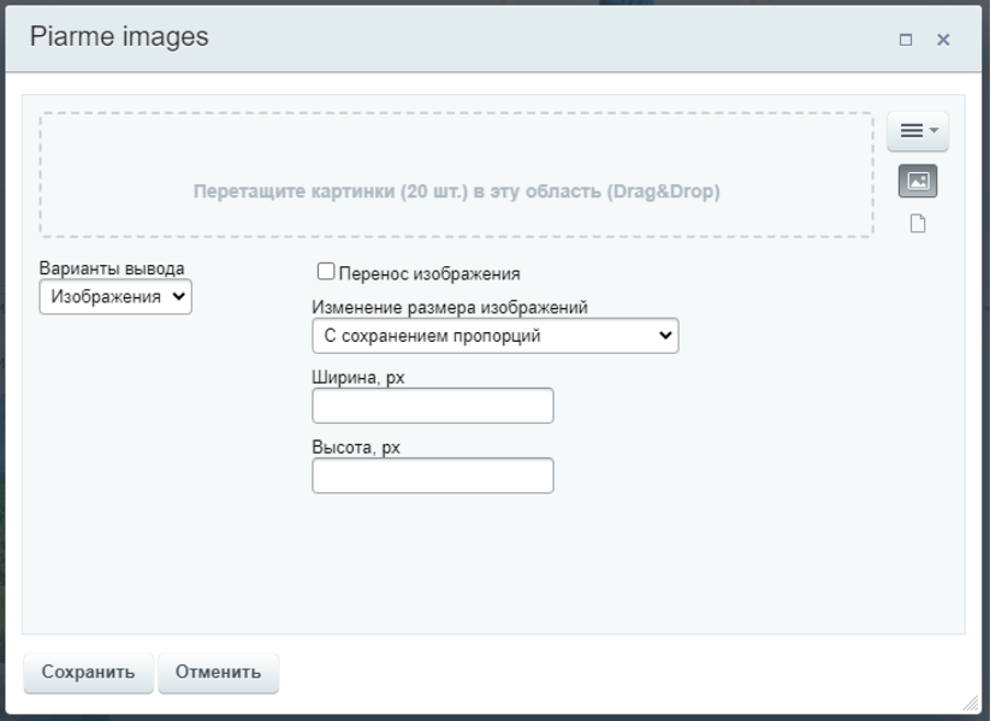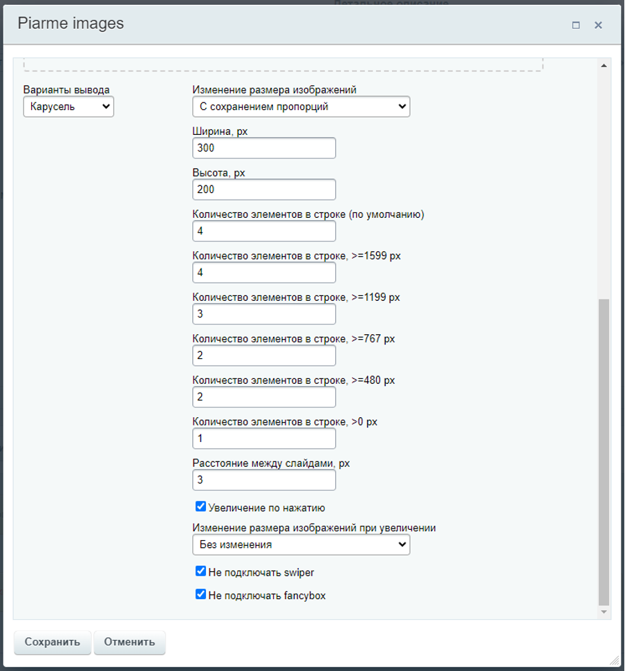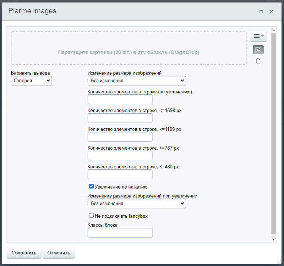 Настройка размеров миниатюр и увеличенных изображений (влияет на фактический размер файлов, при этом отображаемый размер миниатюр автоматически определяется сайтом);