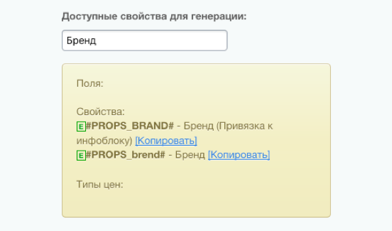 В шаблоне генерации текста и МЕTA-тегов (<title>, <description>) вы можете использовать любые свойства элемента. Также в шаблоне есть возможность подставлять названия элемента, категорию, в которой он находится, и стоимость товара.