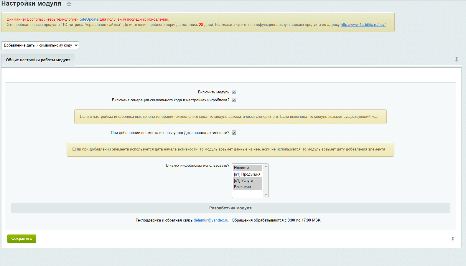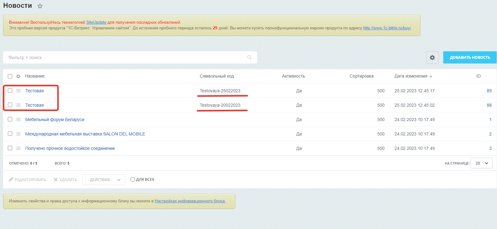 Модуль подставляет дату к символьному коду элемента и таким образом предотвращает ошибку дублирования.