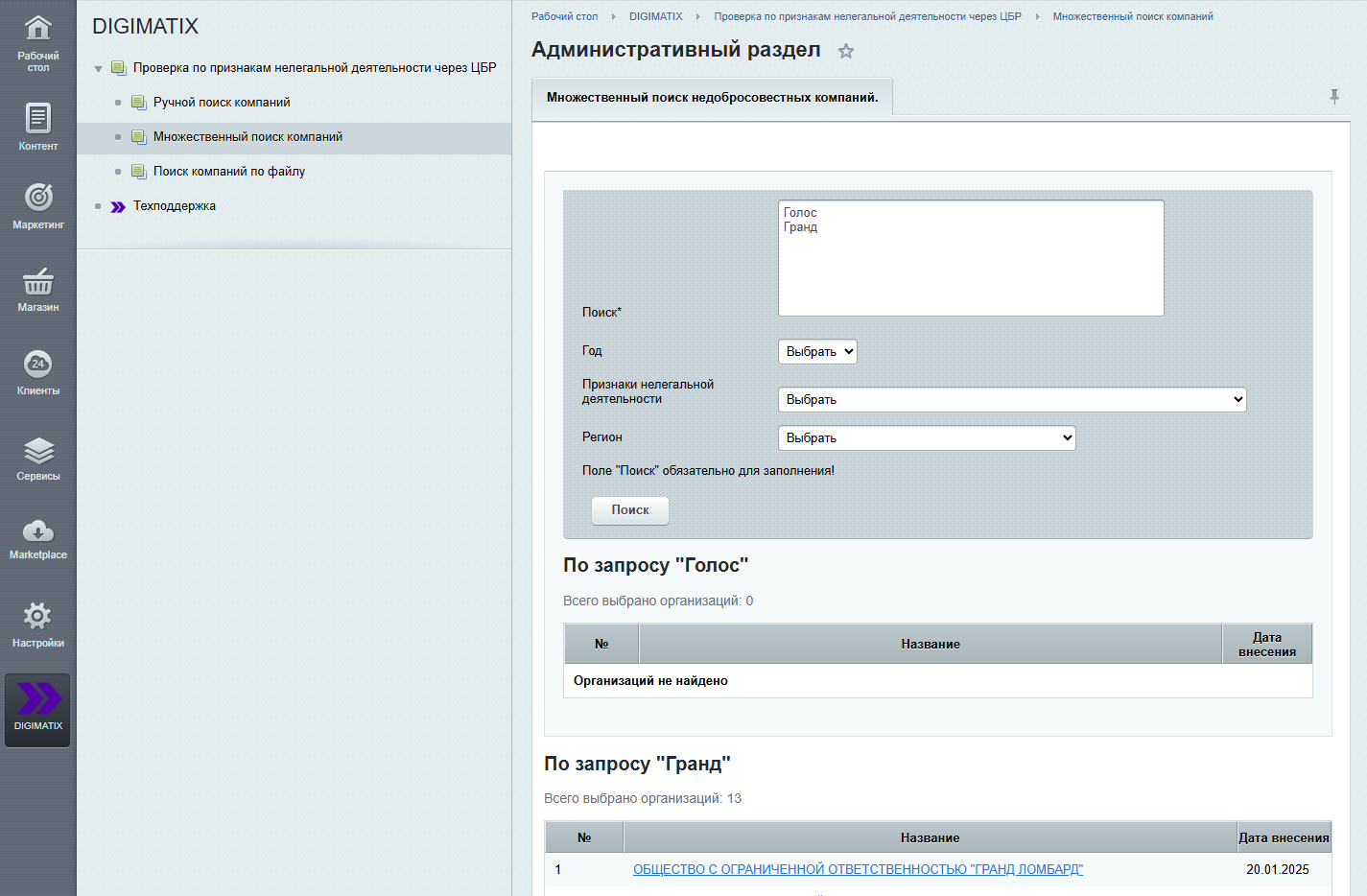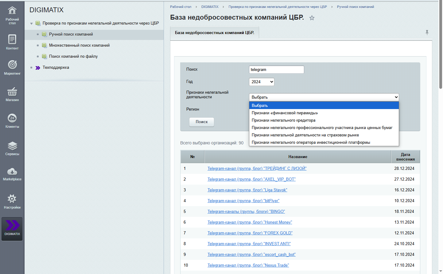 Модуль предназначен для ручной контрагентов на наличие признаков нелегальной деятельности на основе данных Центрального Банка России.