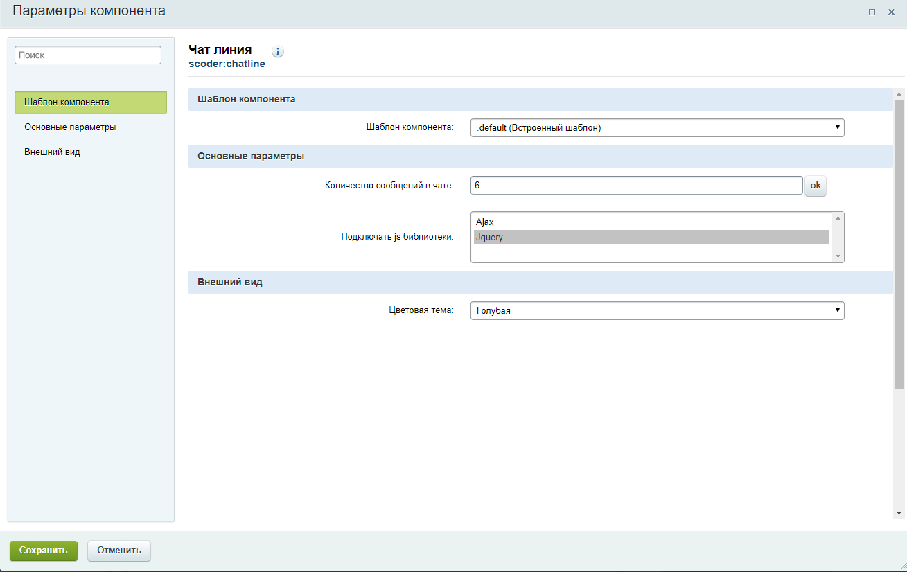 Чат реализован с помощью ajax технологии, линия обновляется периодически через интервал времени. Для корректной работы необходимо подключение библиотек jquery и ajax, тоже задается в настройках компонента.
