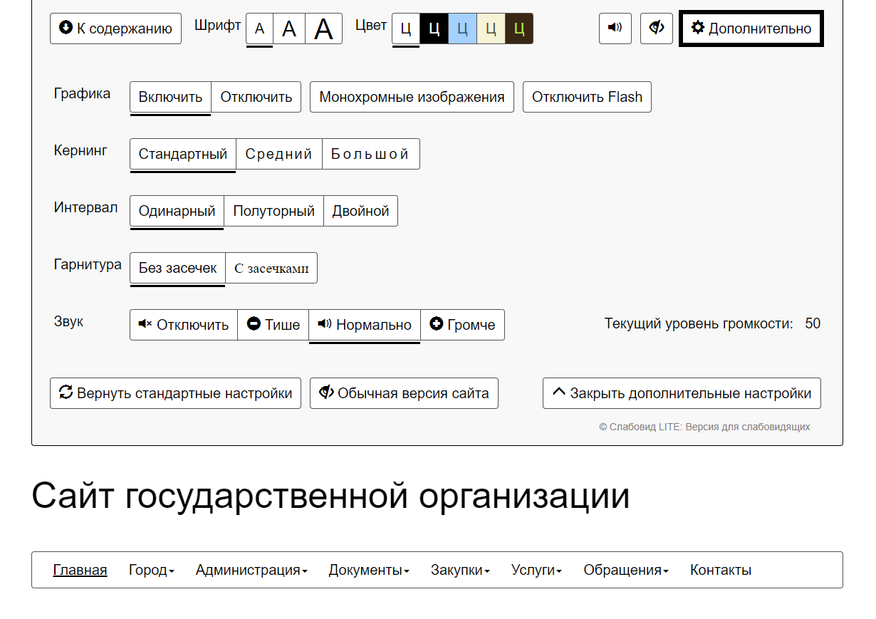 - Контент каждой страницы может быть представлен в двух форматах — основной и «версия для слабовидящих»