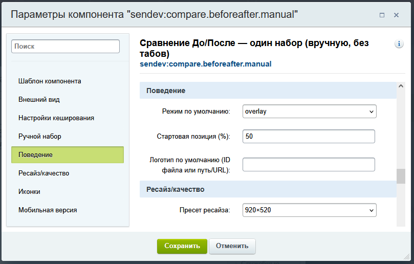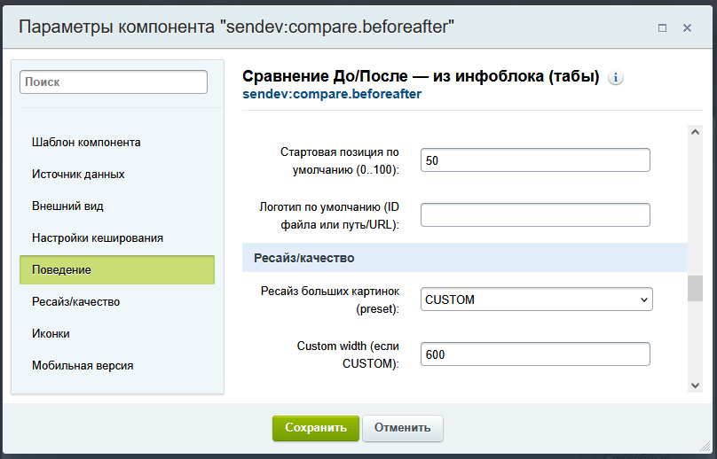 - Компонент из инфоблока — для портфолио/галереи “До/После”, когда нужно выводить множество примеров и переключаться между ними.